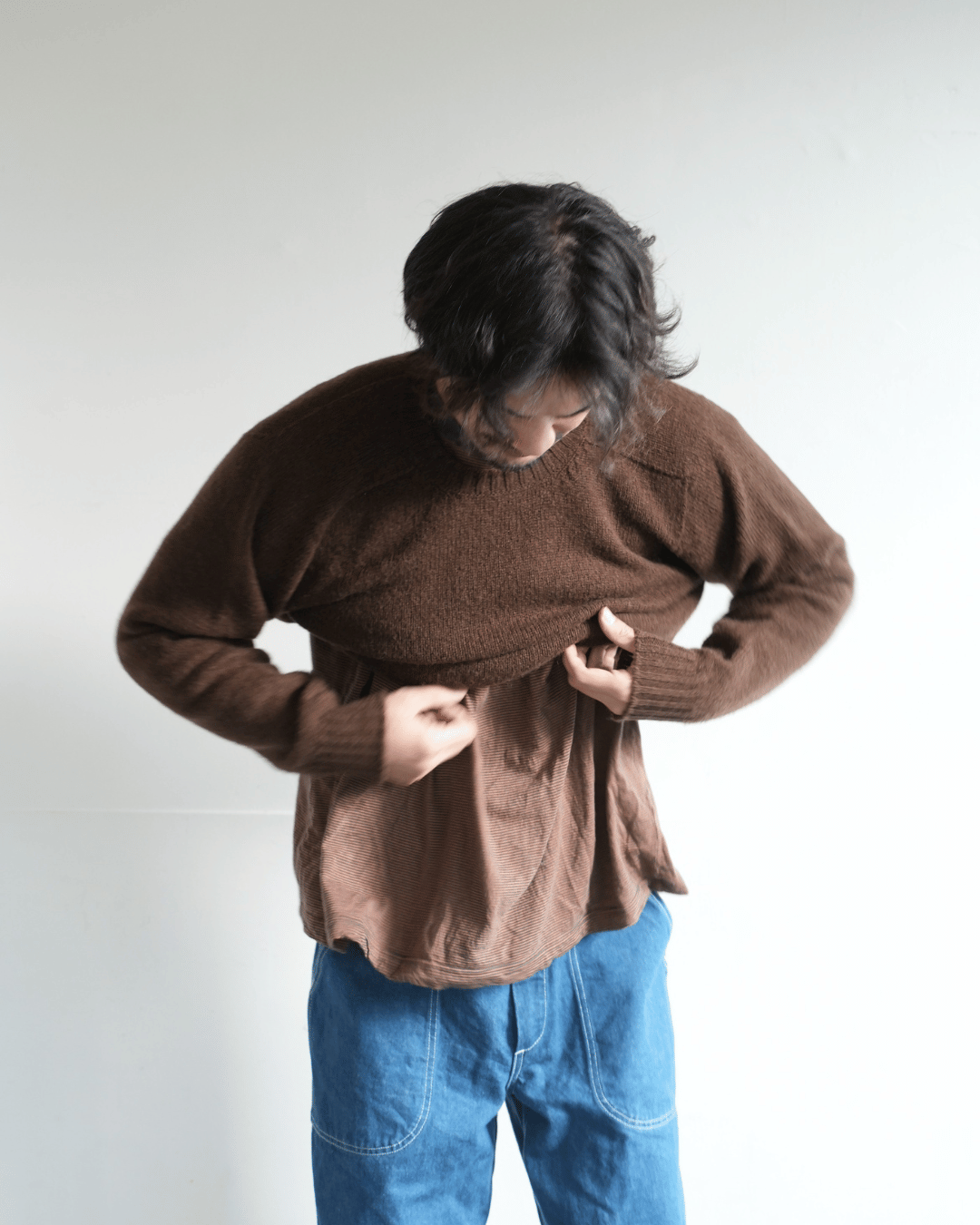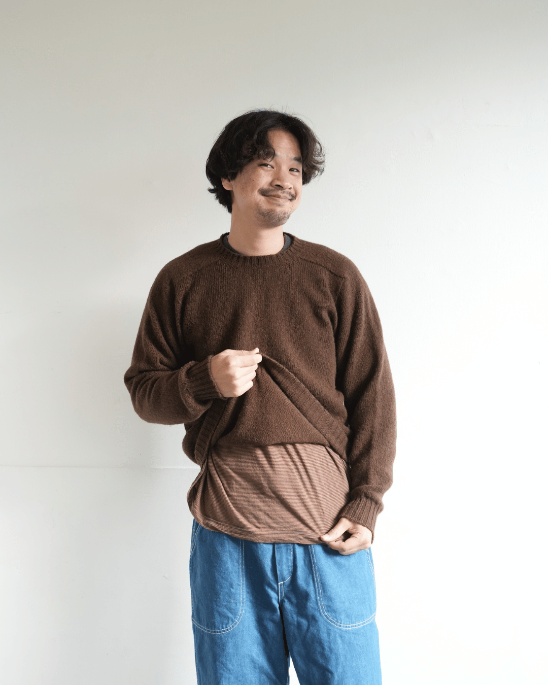 太目のパンツを合わせてゆったりとしたシルエットを楽しむ。