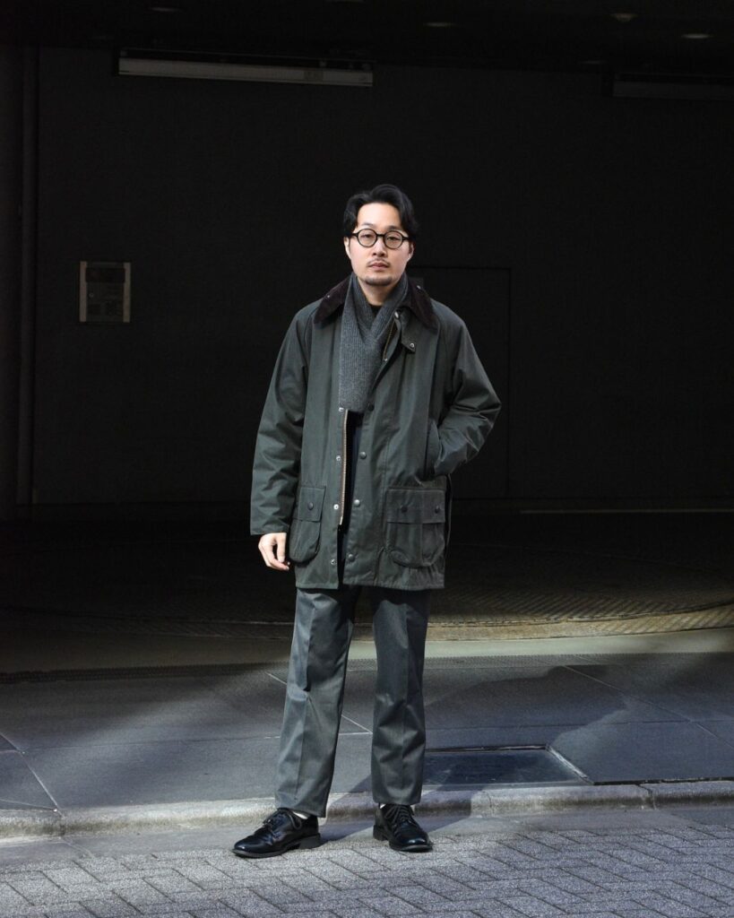 街中でもお仕事使いの方をよく拝見します。本日着用のビューフォートはやや長めの着丈に設定されておりますので、ジャケットの上から羽織っても裾が綺麗に収まるのが魅力です。