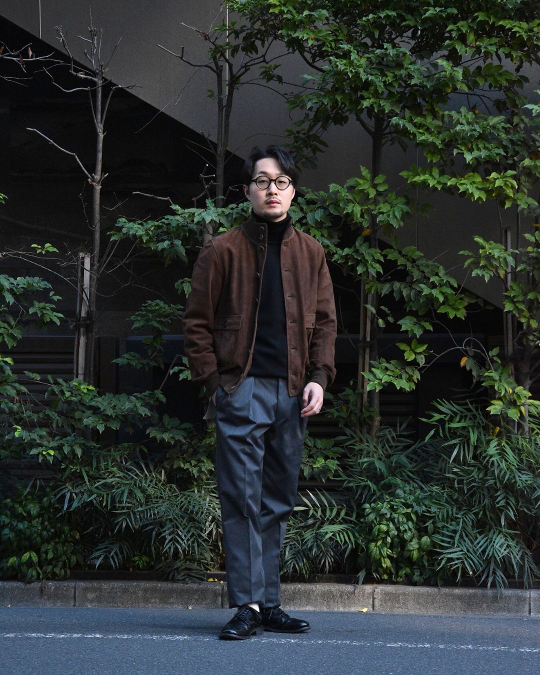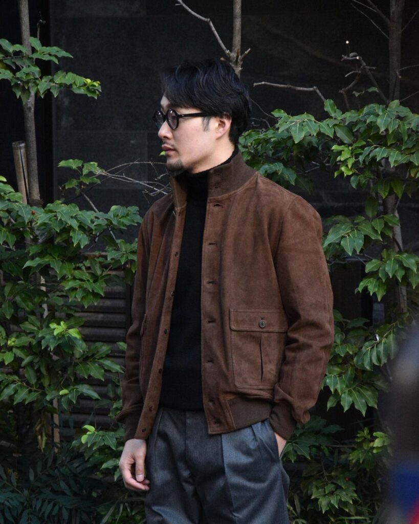 革ジャケットの中でも手に取りやすいのがスウェード素材。武骨過ぎず柔らかな印象でカジュアルスタイルにも良く馴染みます。