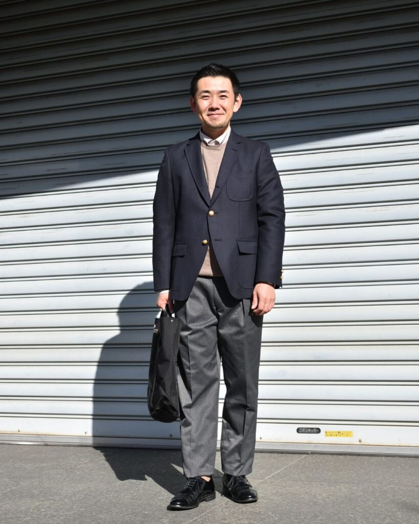 中でもグレーのスラックス合わせは大人な組み合わせですので、カジュアルアップに最適だと思います。」