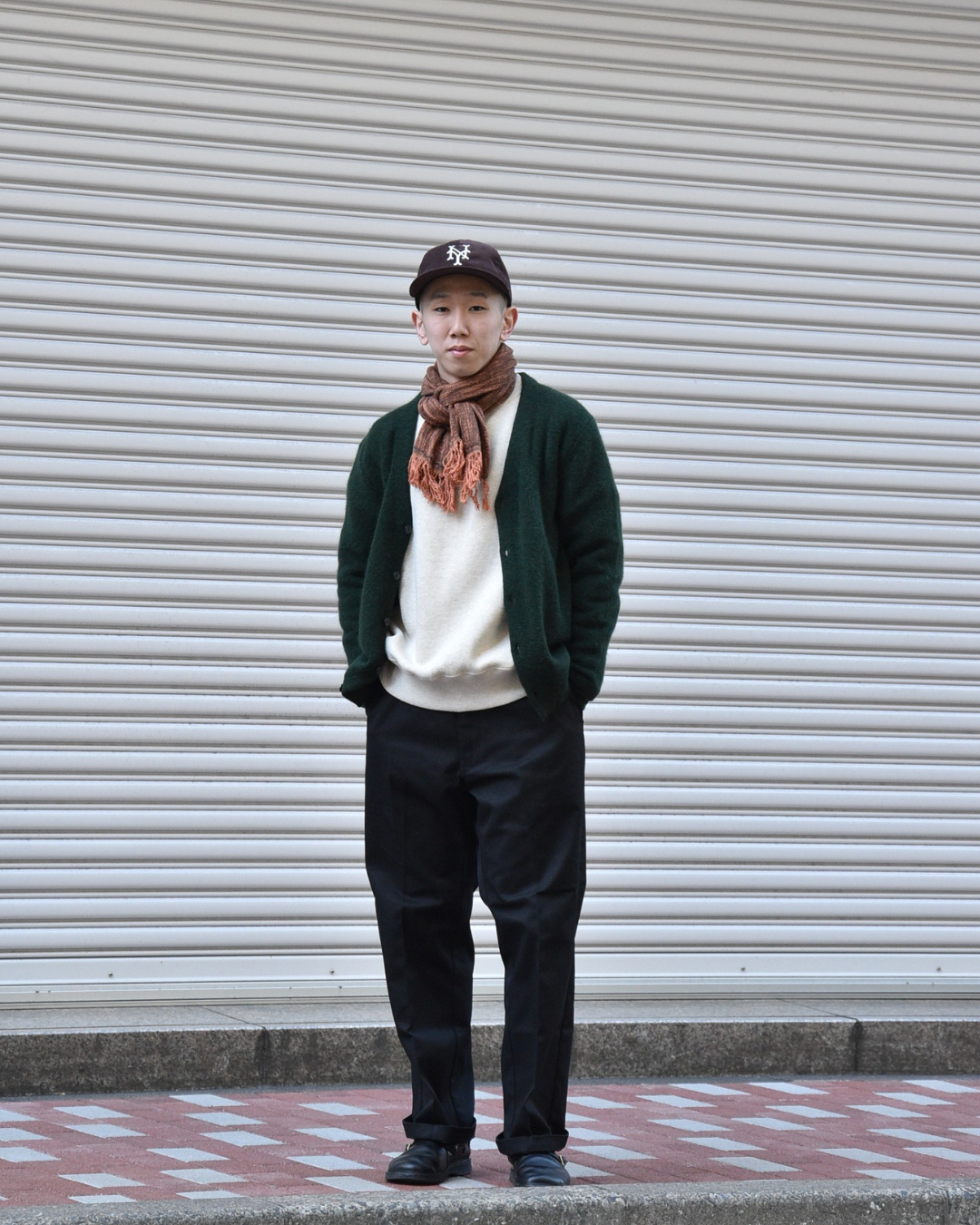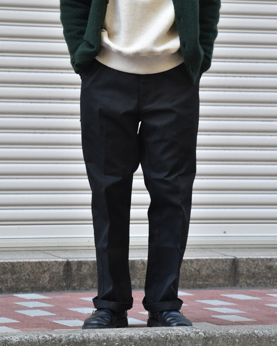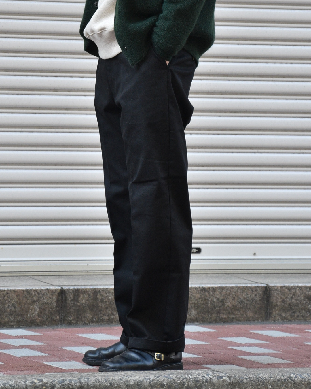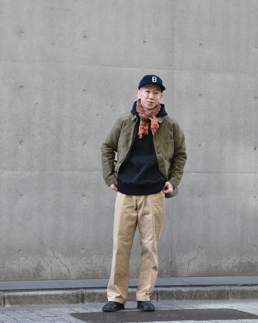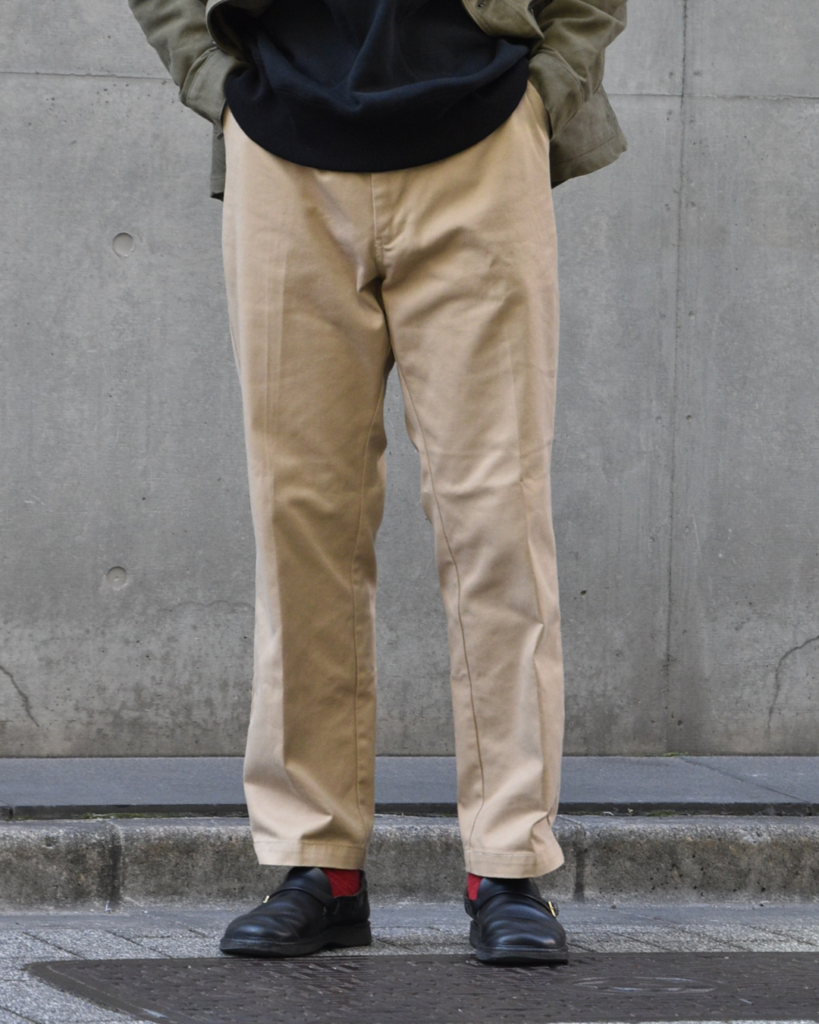 アメカジなカバーオール、パーカーなどのアイテムとは勿論相性抜群。カジュアルなパンツとは言え、クリース入りですから、少し大人な見え方です。