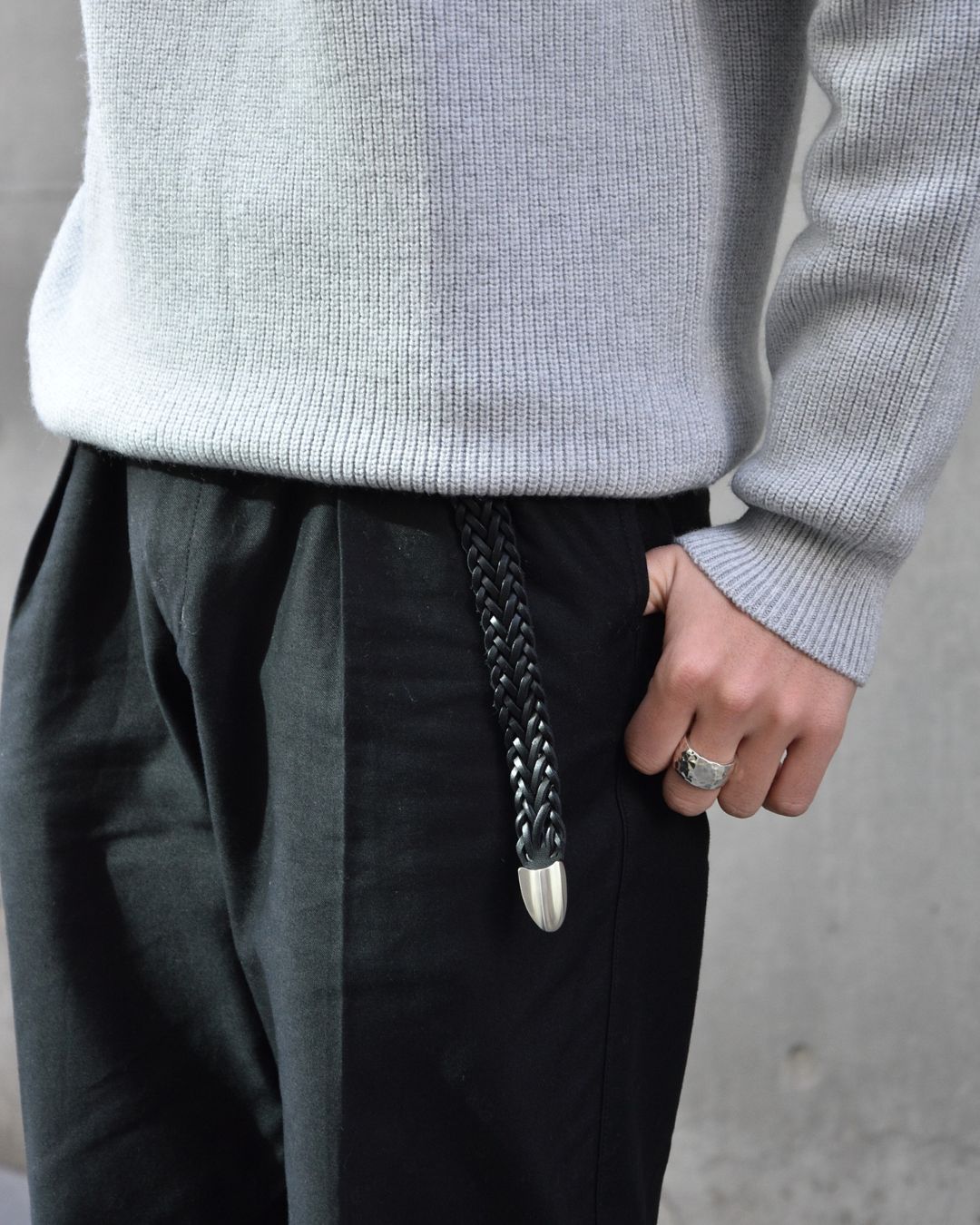 間違いない組み合わせ。黒レザー×メッシュで、シンプルなデニムスタイルがワンランク上の雰囲気に。軽く垂らす着け方もハマります。