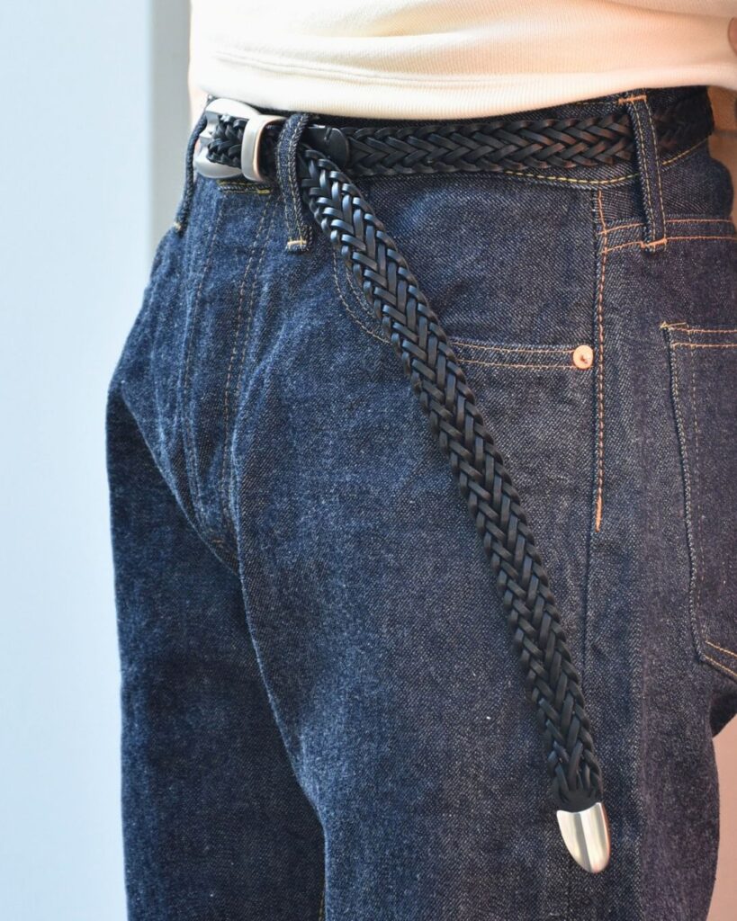 バックルと先端金具はウエスタンベルトのような雰囲気で、細めの幅でもしっかり主張してくれます。