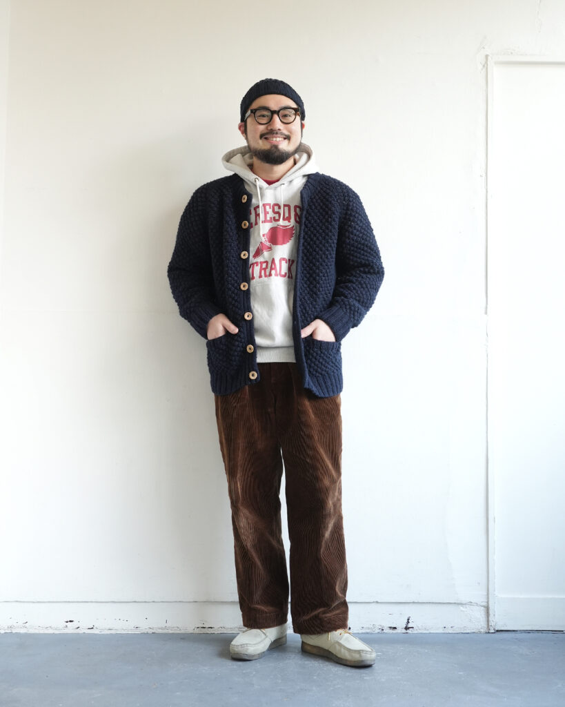 ブラウンの太畝コーデュロイとの組み合わせは間違いなく好きなやつで、ネイビー×ブラウンがめちゃくちゃ相性◎