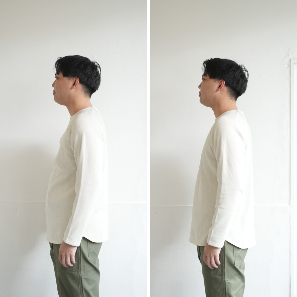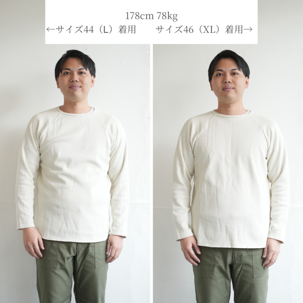 インナーとして使うにも44(L)だと袖が短く感じますし、身幅もややピタッとします。