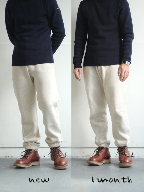 これこそ吊り裏毛の最大の特徴でして、洗濯による縮みよりも、着用による伸びの方が若干勝つのです。確かに洗濯してすぐの状態で穿くと、かなり細く感じますが、
