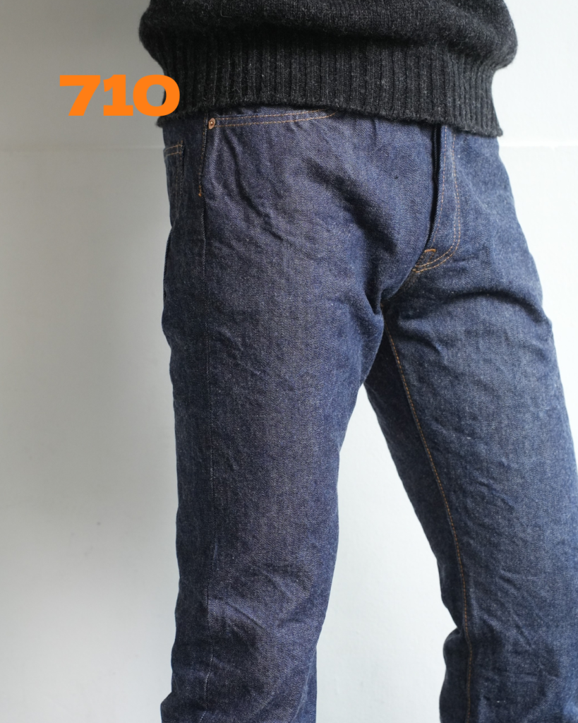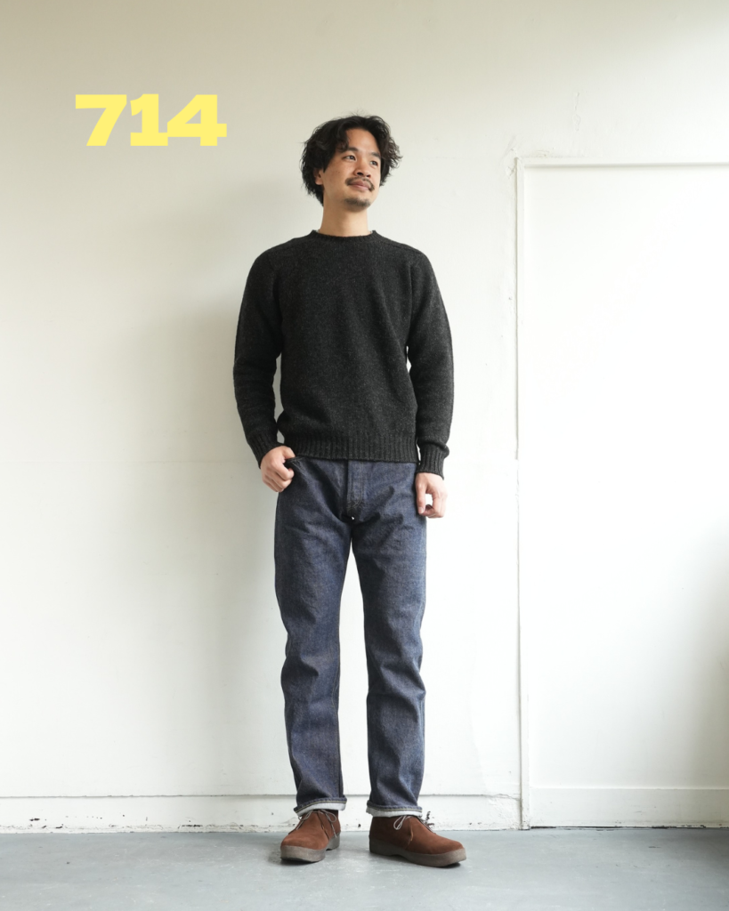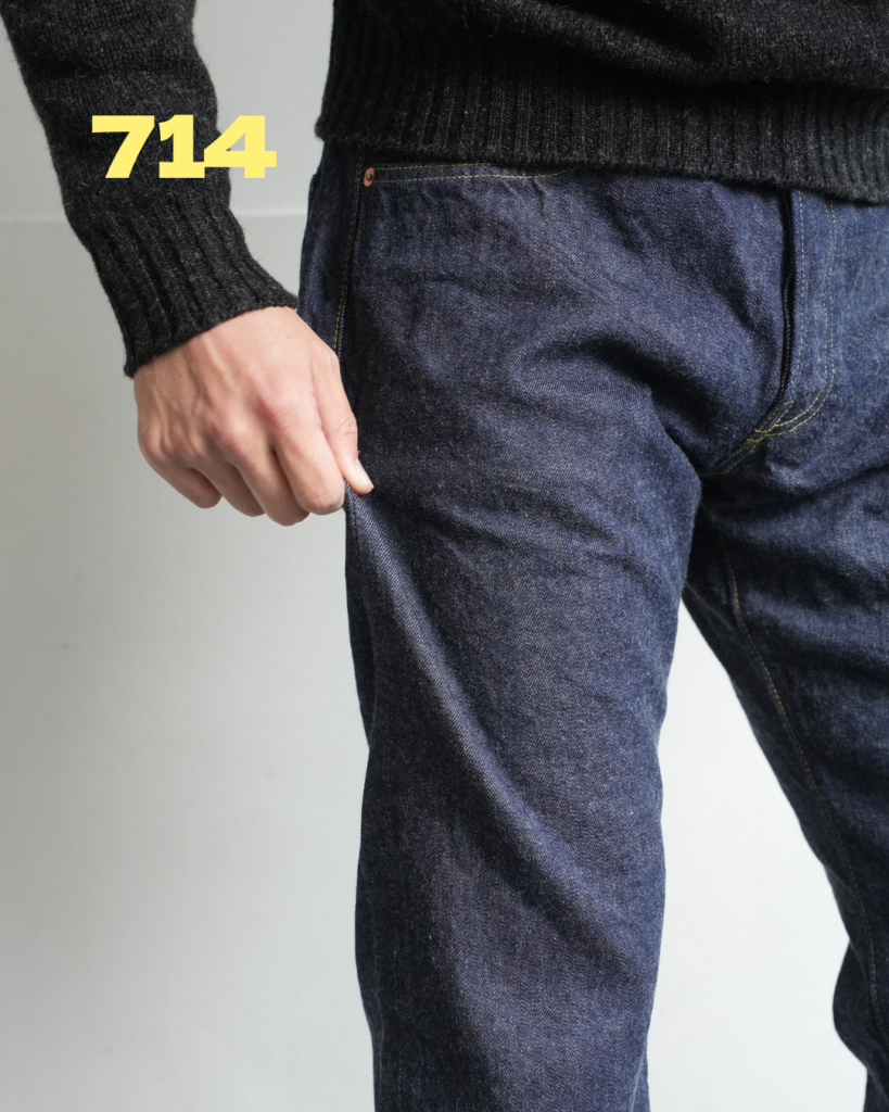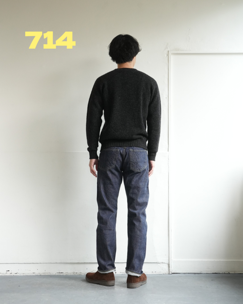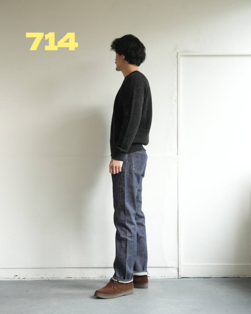 714の方が全体的にゆとりあり。どちらも緩いテーパード具合。