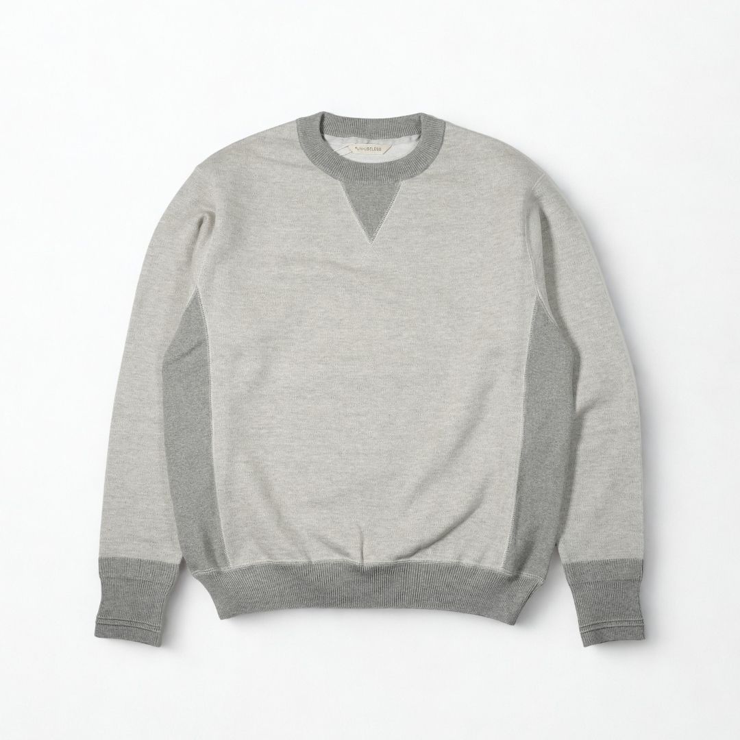 ブランドの看板モデル、ヴィンテージスウェットのようなはめ込みVガゼットや両脇のリブに加えてニットならではの編み柄をリブに取り入れたデザイン。