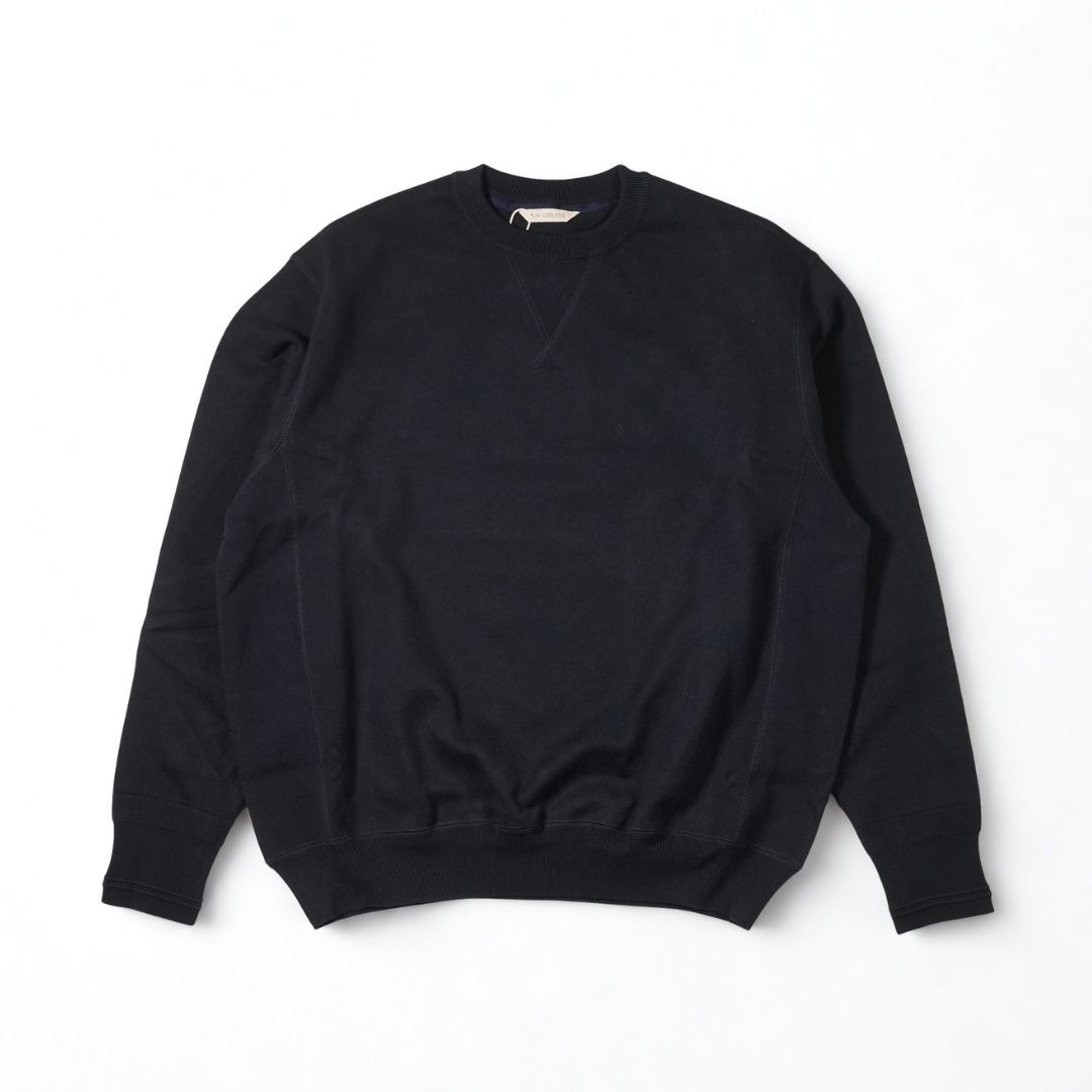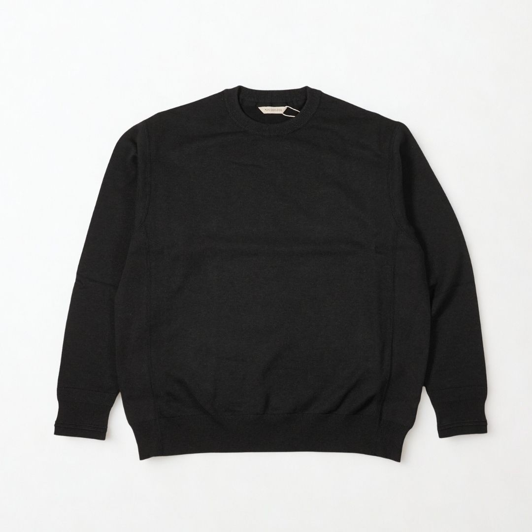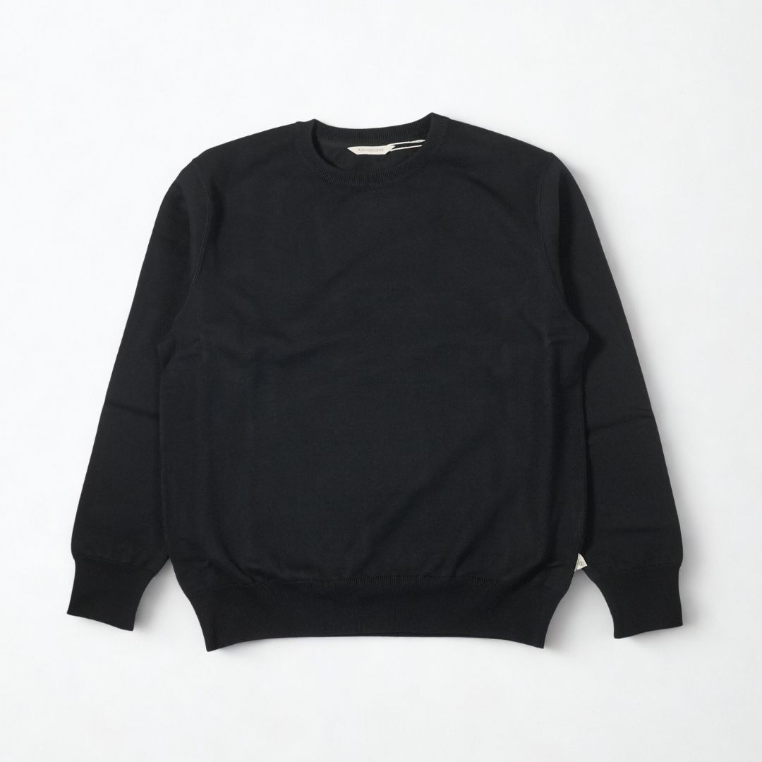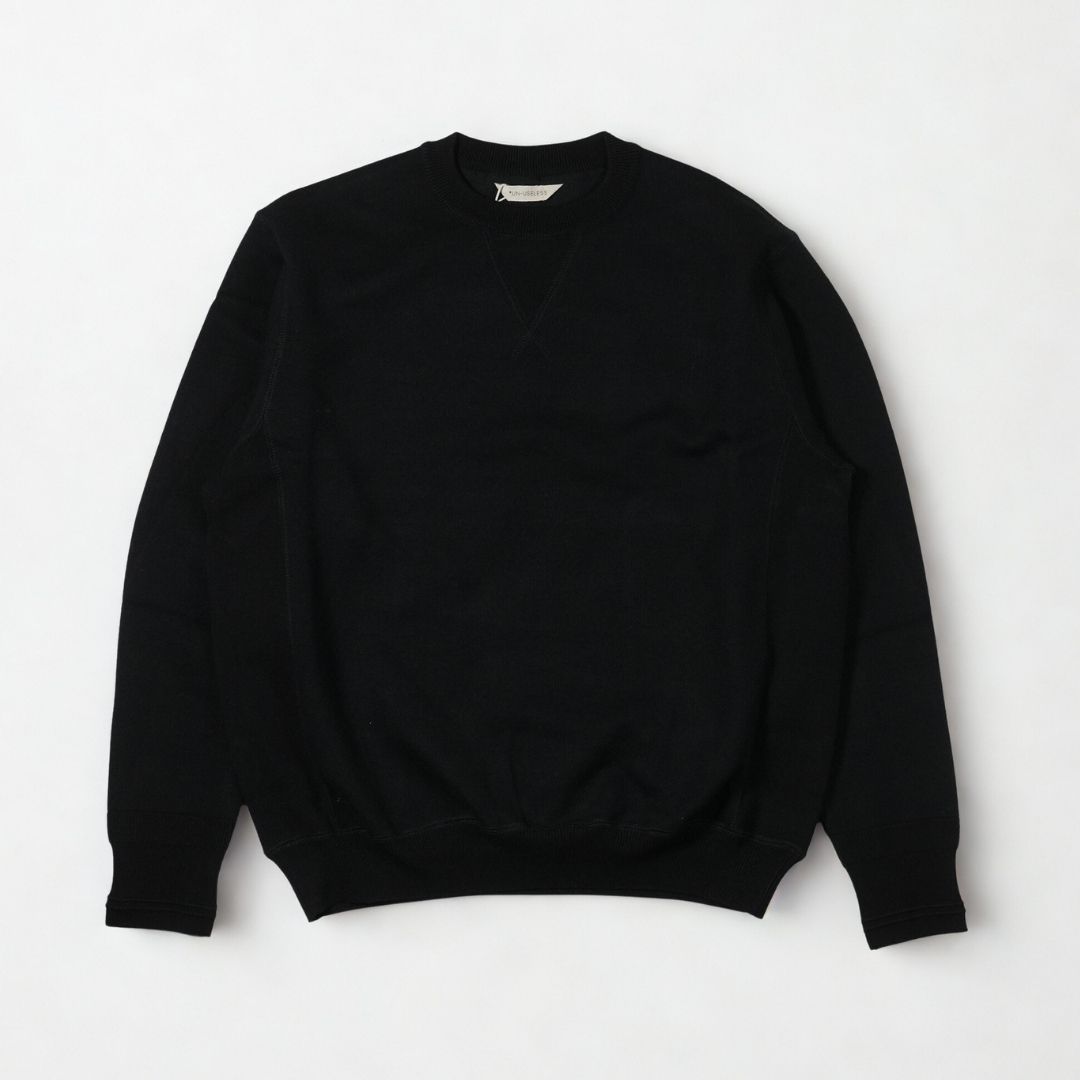 同ブランドの代表モデル「CREW NECK SWKNIT」よりもやや細身なスッキリシルエットで、首元のはめ込みVガゼットと両脇のリブ、袖リブの編み柄も無くしよりミニマムなデザインに。