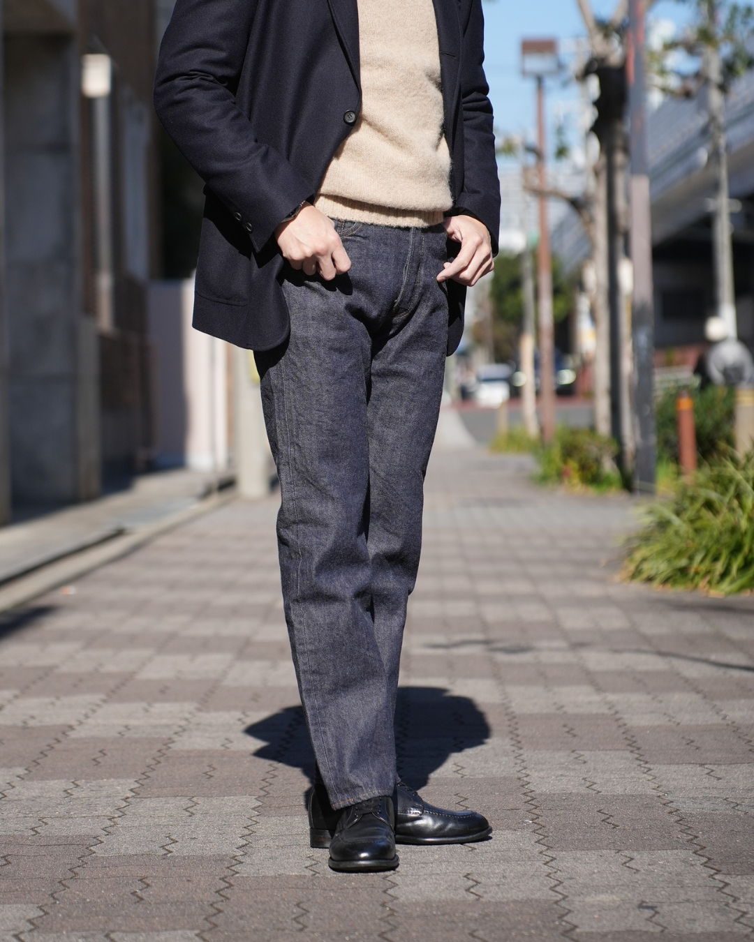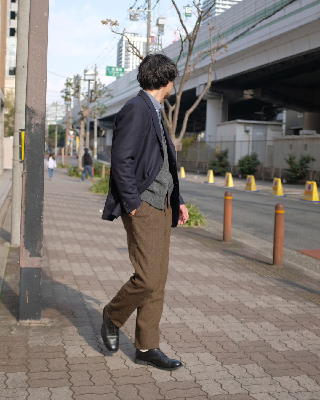 あくまでも羽織りとして取り入れる紺ブレスタイルです。