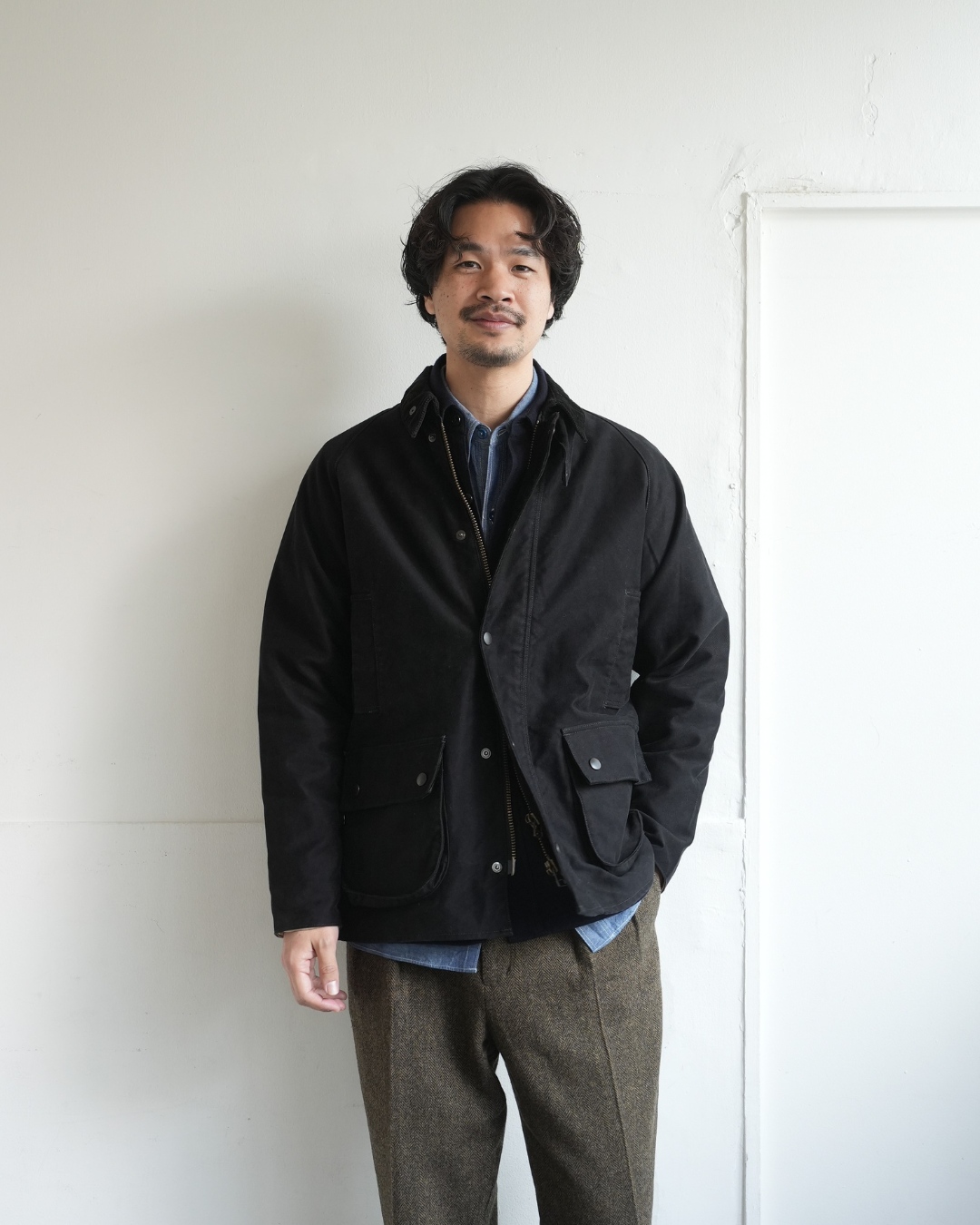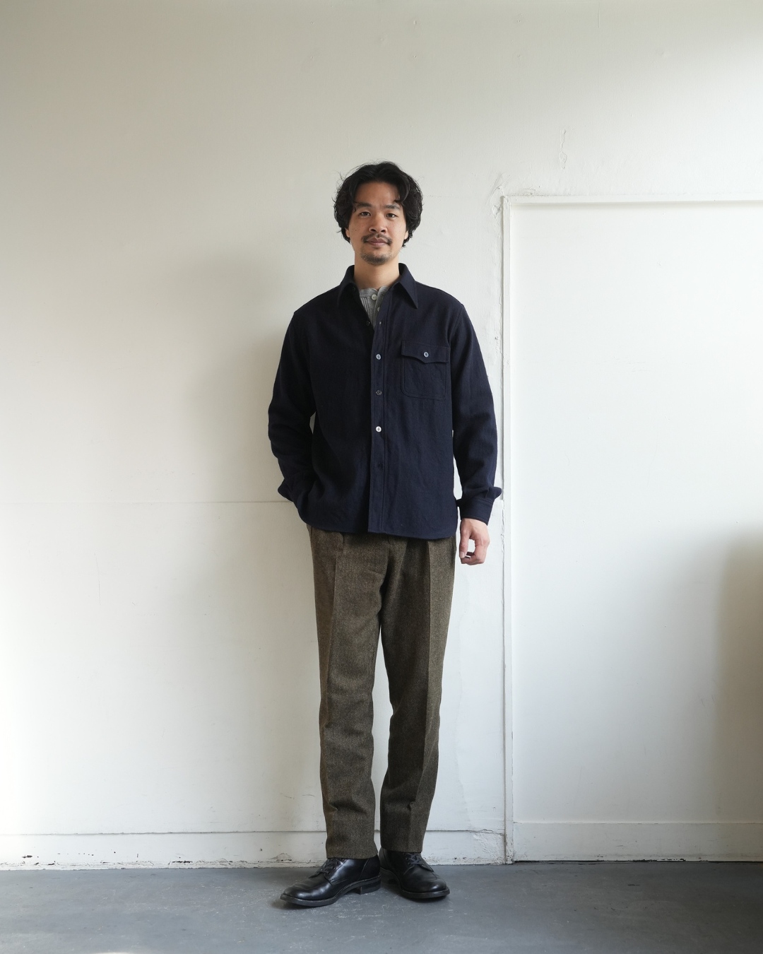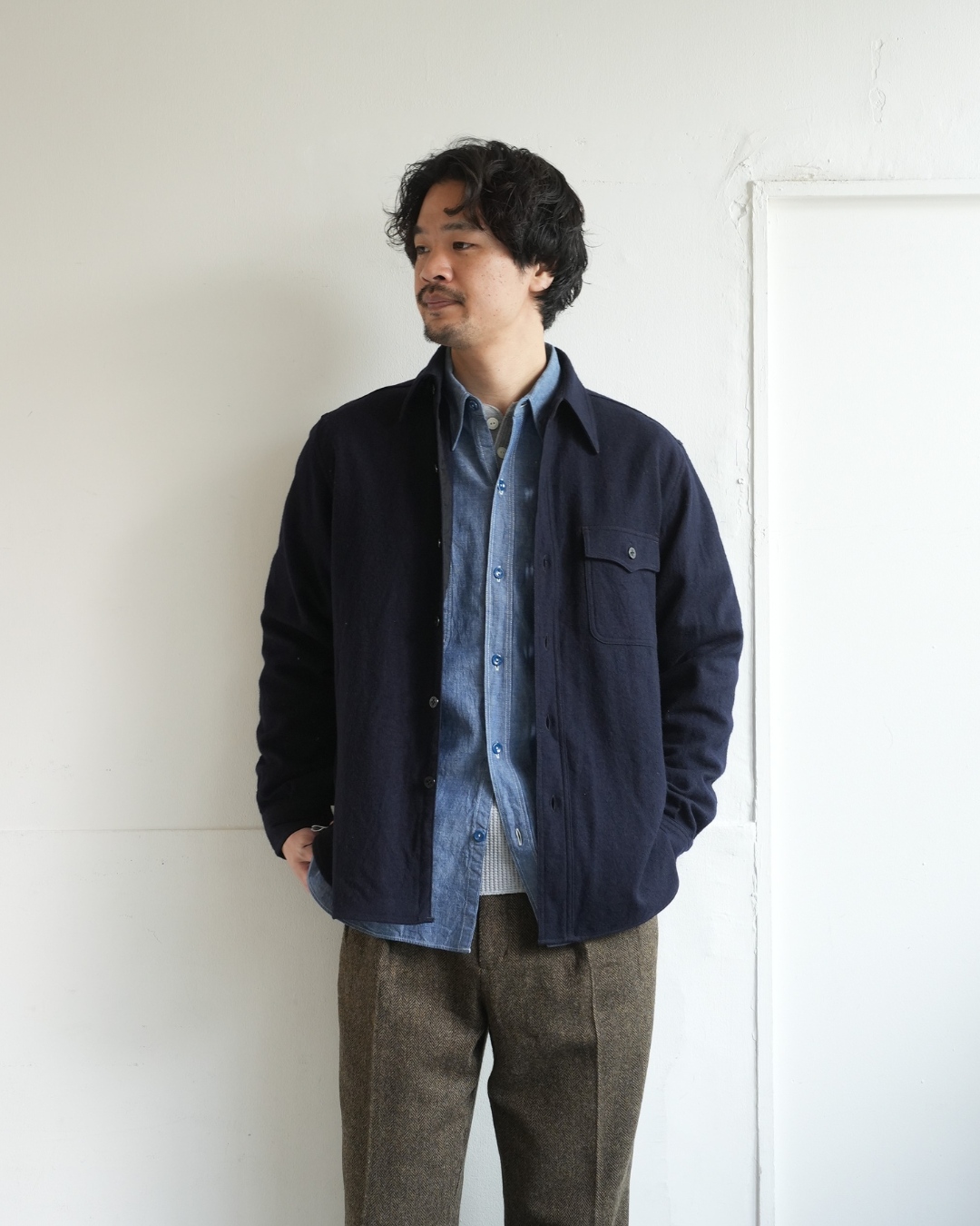 シャンブレーシャツにウールのCPOを着用。元船乗りという設定がしっくりくるワードローブ。