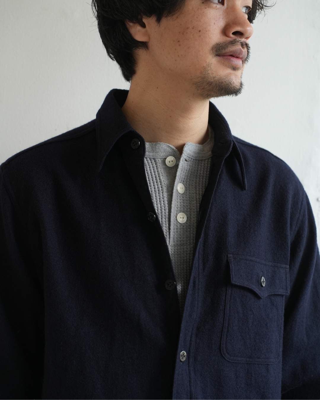 インナーはもちろんTシャツでもいいけれど、ウールの雰囲気に抜群に合うのが、コットンサーマル。