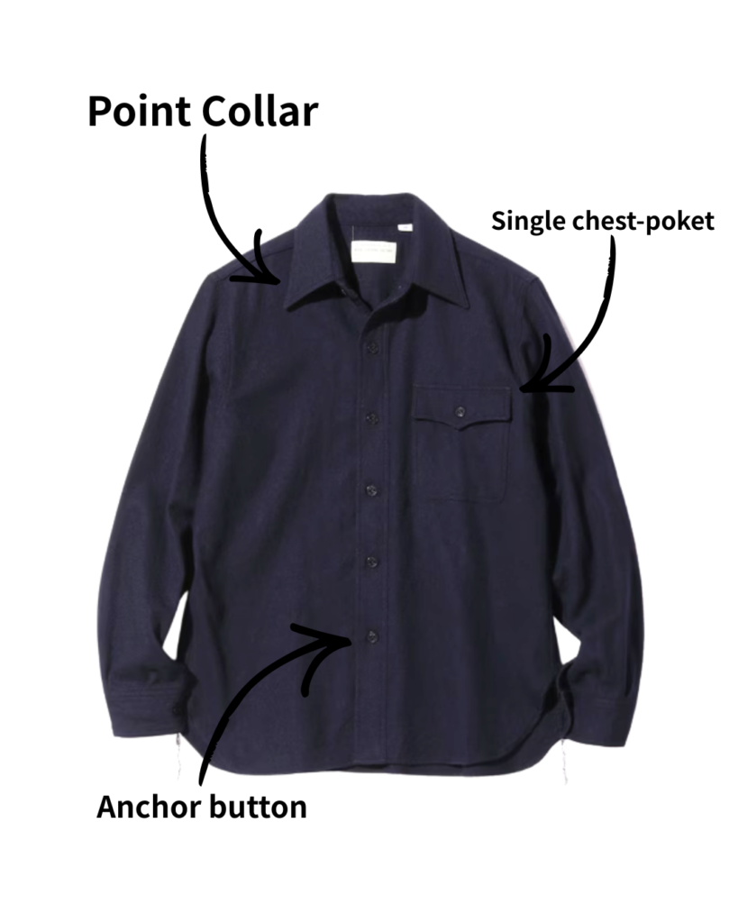 先の尖った襟、胸にはフラップのついたポケットが一つ(40年代以降ポケットが二つに)。錨マークが刻印されたボタンが特徴で、段階的にこのシャツが廃止されていった1960年代後半まで、その姿はほとんど変わらなかったといわれています。
