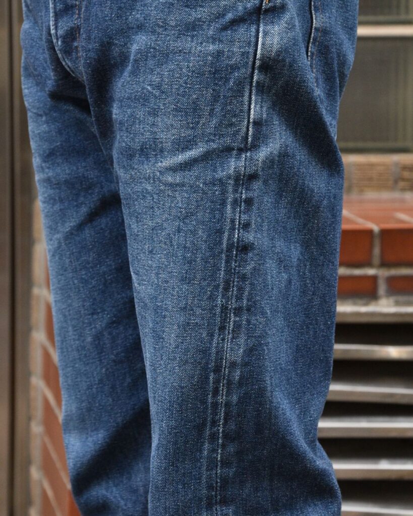 負荷がかかるところはこれまで通り伸びますが、余りのあるところはスッキリと変化しるのがデニムの面白いところ。