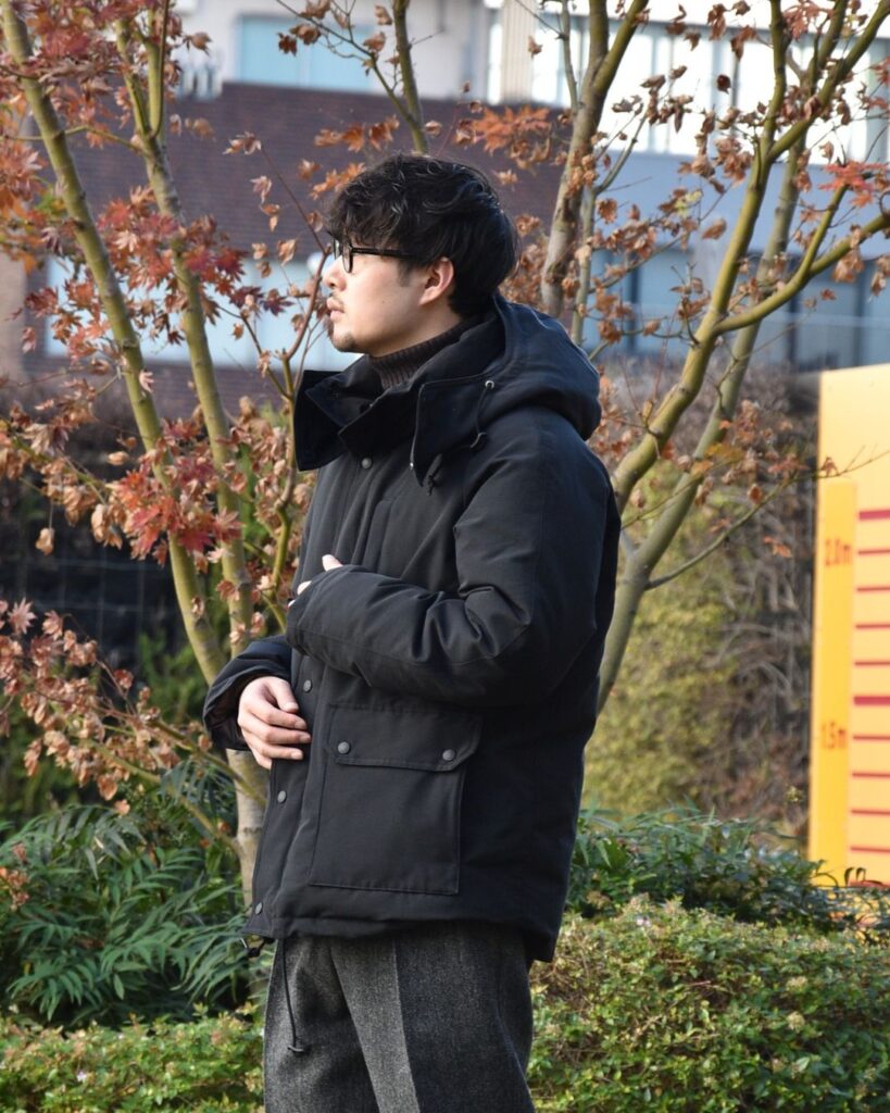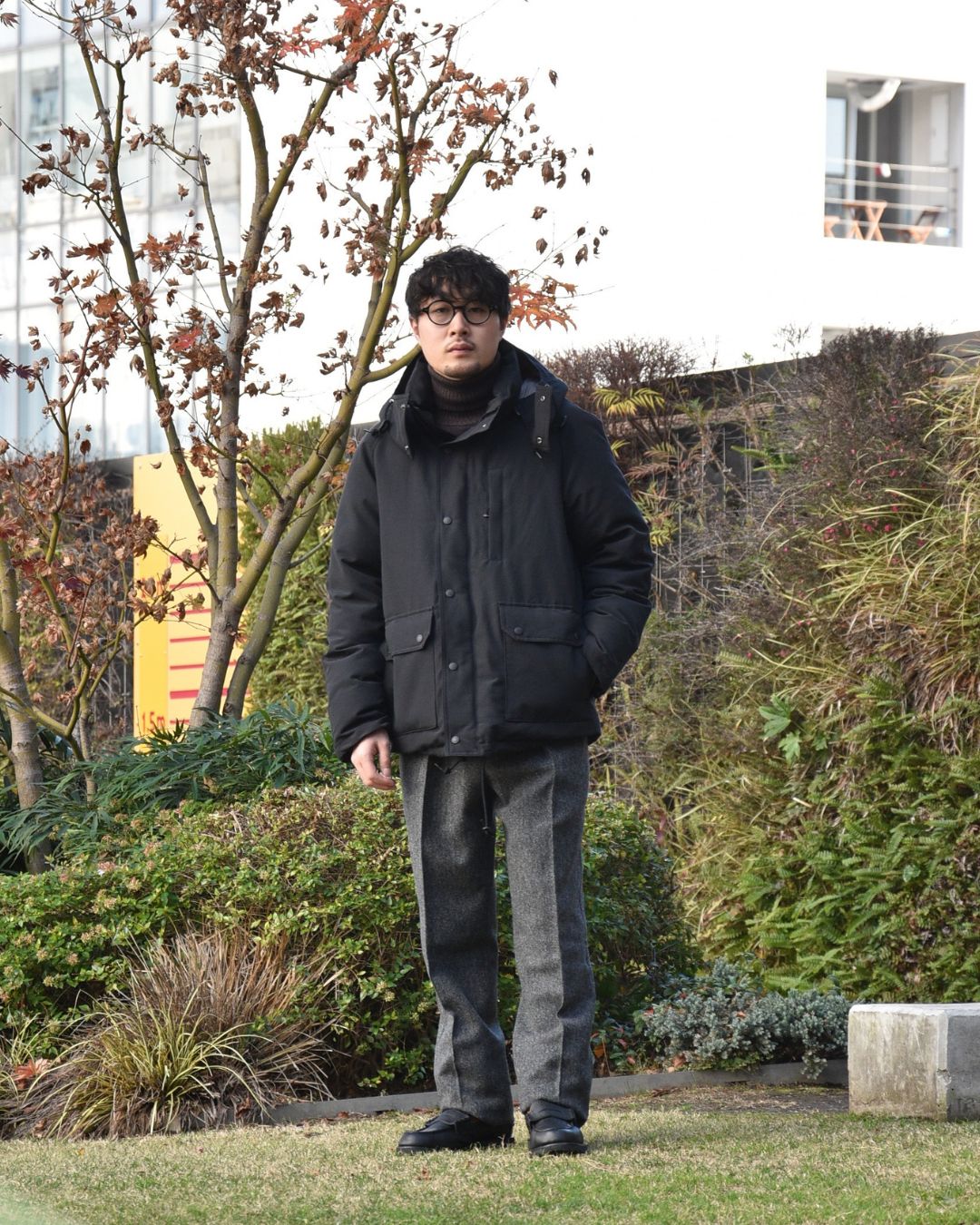 タートルニットにツイードパンツのキレイ目な合わせに、クラシカルなアウトドアウェアのバランスが、今の気分ともマッチしておりバランスの取れた大人カジュアルだと思います。