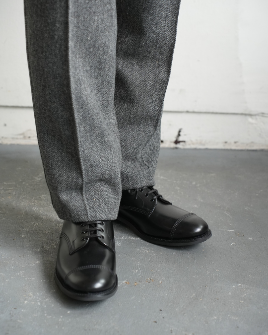 ミリタリーダービーは外羽根のキャップトゥで、革靴の中では比較的カジュアルに使いやすい部類です。なので、トップスはブルゾンなどのカジュアルな物でも、ジャケットのようなフォーマルな物でも、どちらでもそれなりに雰囲気良くコーディネートして頂けます。