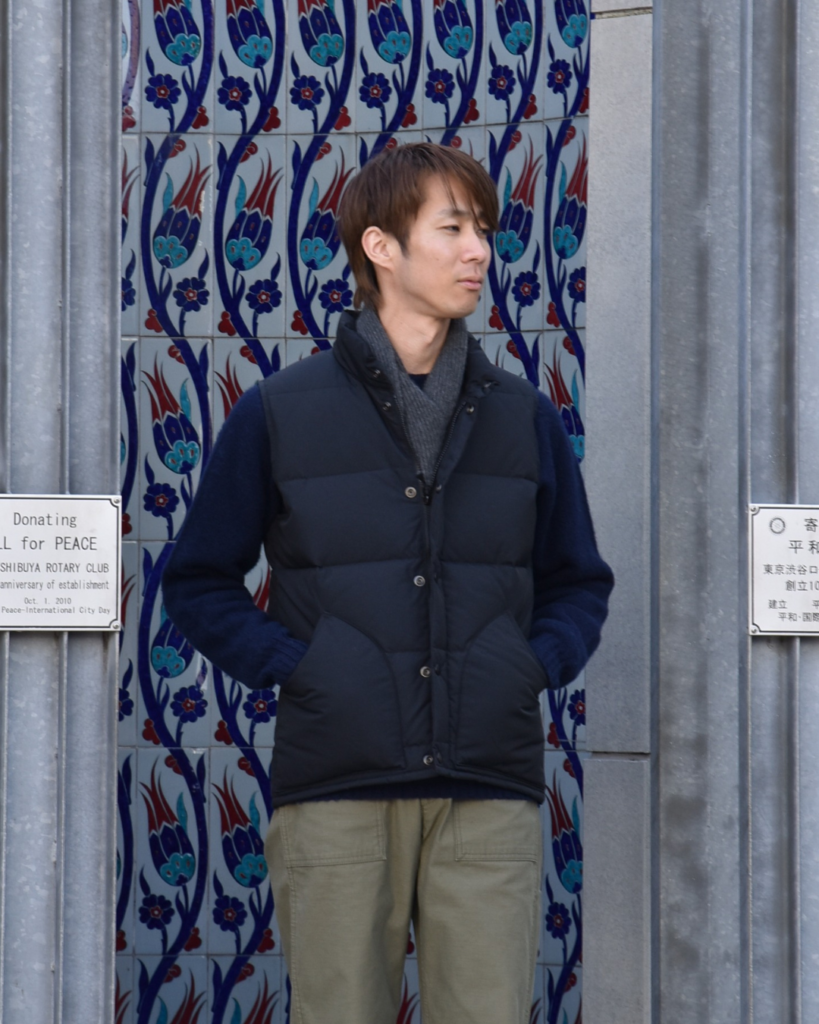 上にZANTERのダウンベスト。可動域を確保する。ハーレーのセーターとの相性はバツグンだ。