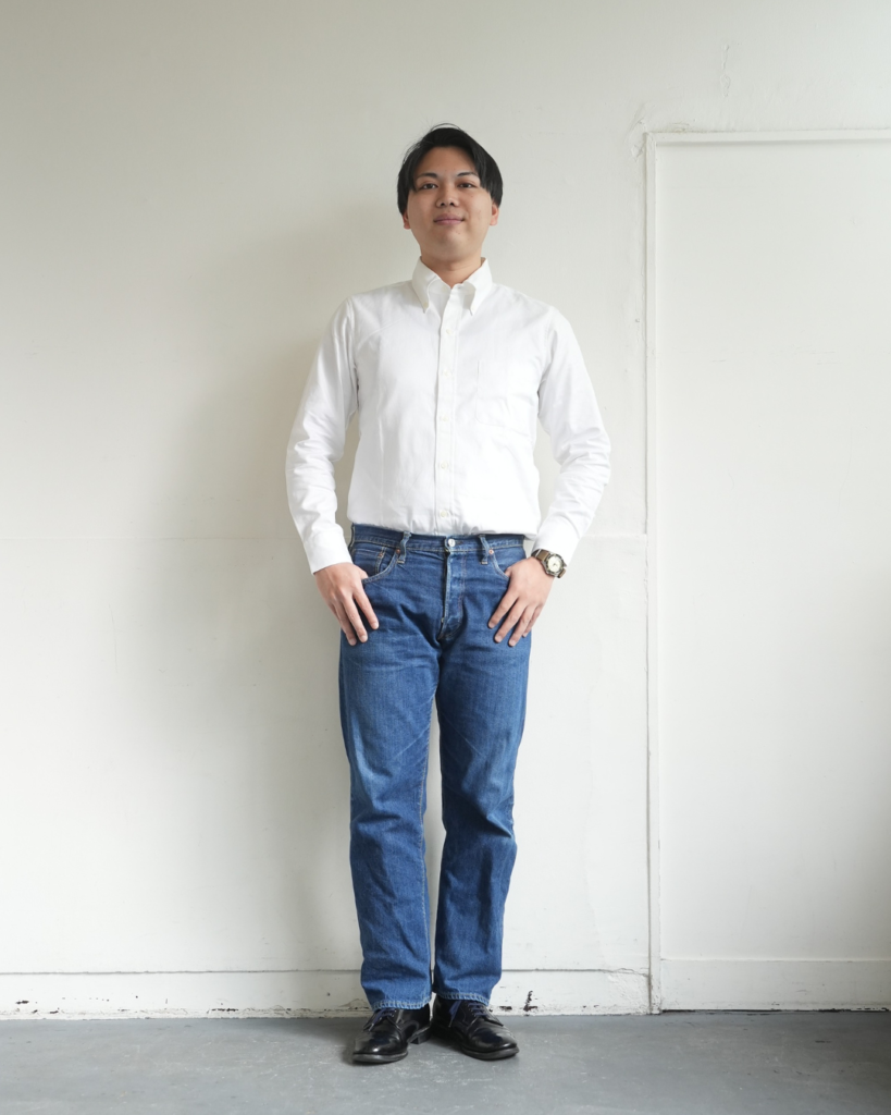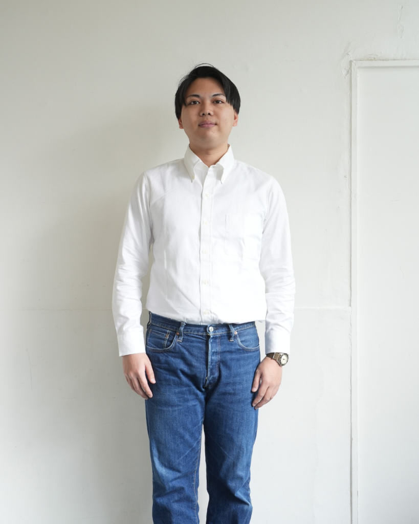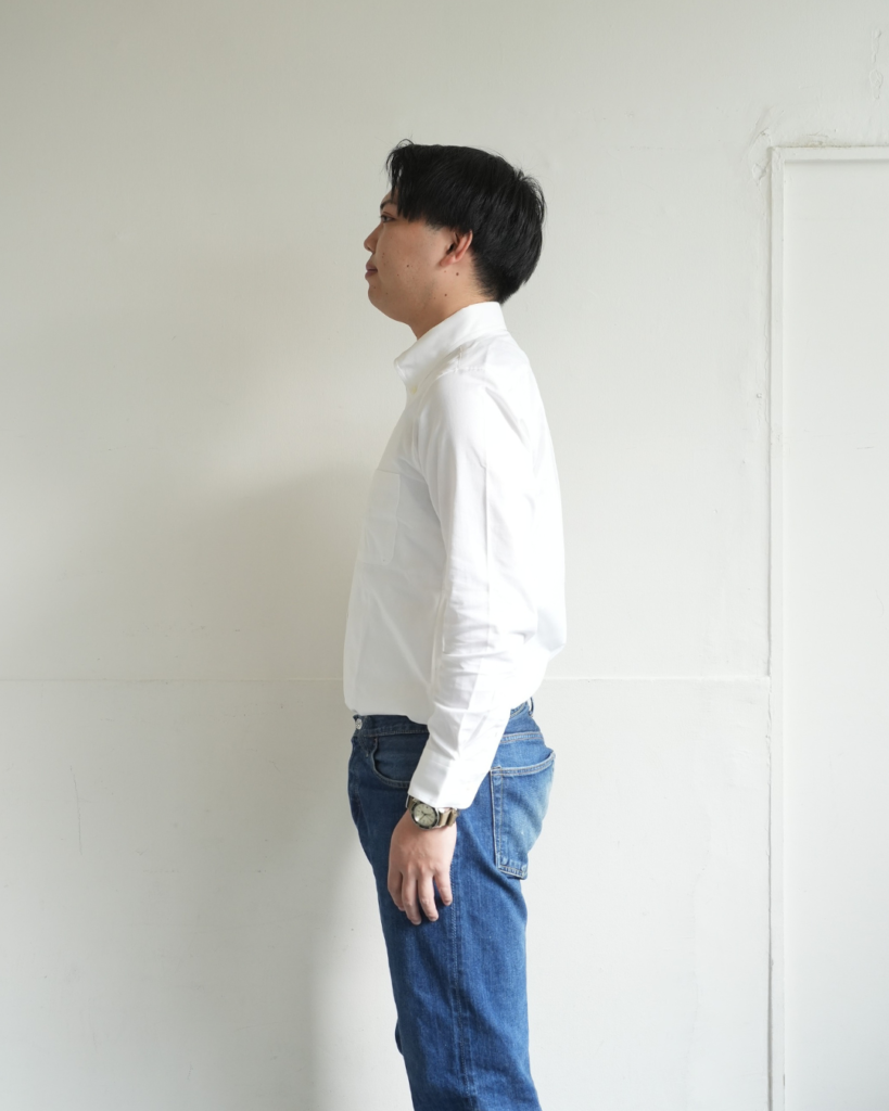 どちらかというと標準~細身の方ほどしっくりくるシャツだと思いますが、ガッシリ体型の杉本でも難なく着れますので、まずは一度お試しあれ。
