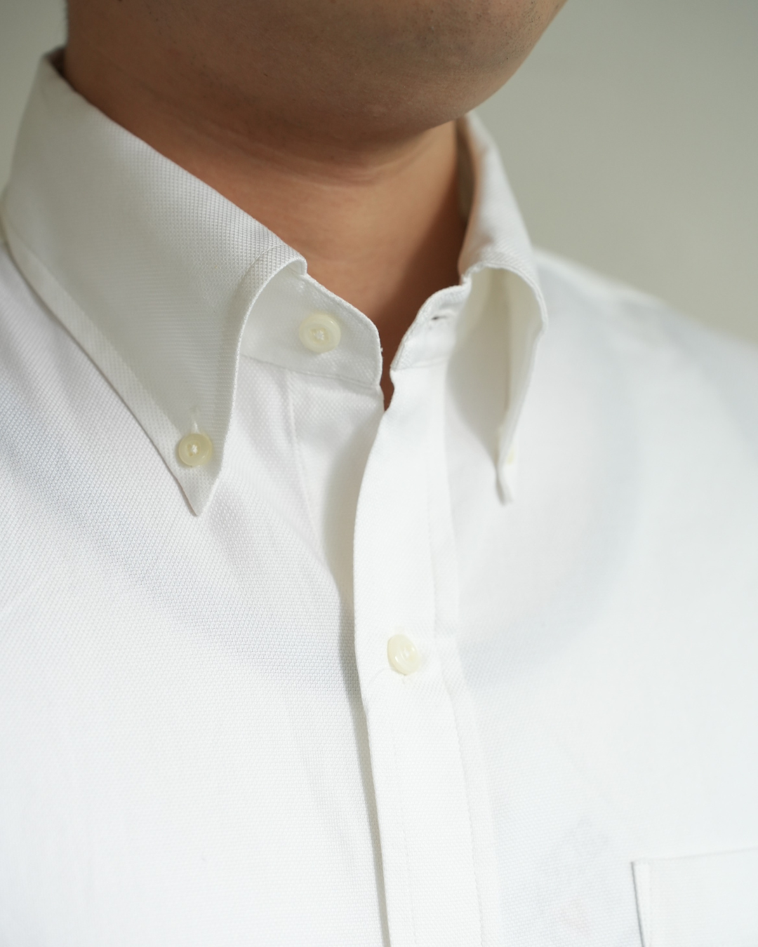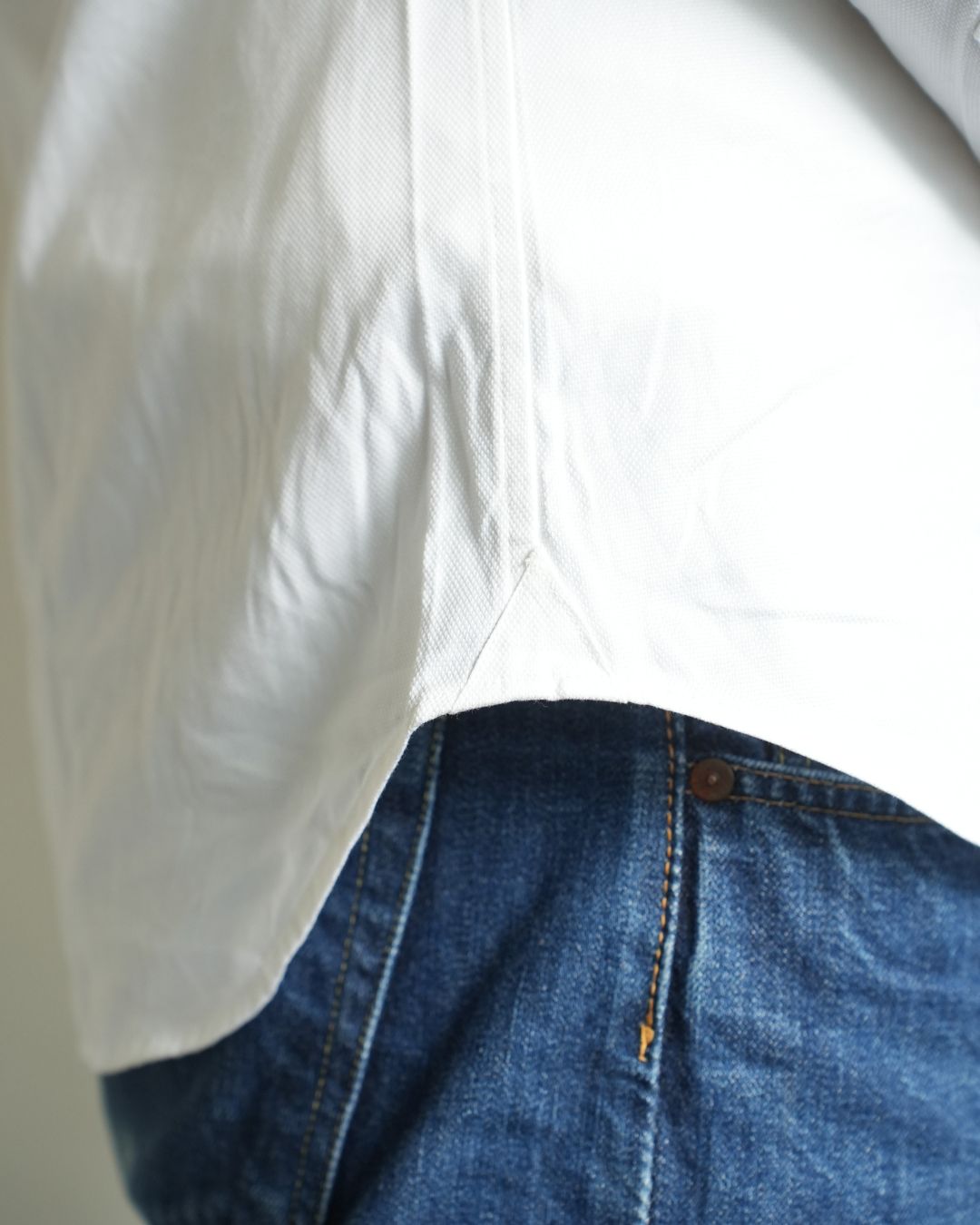 こちらで着ているのがロイヤルオックスフォード生地のシャツ。細い糸を用いて織られたオックスフォード生地で、ソフトで光沢のある上質なシャツ生地です。