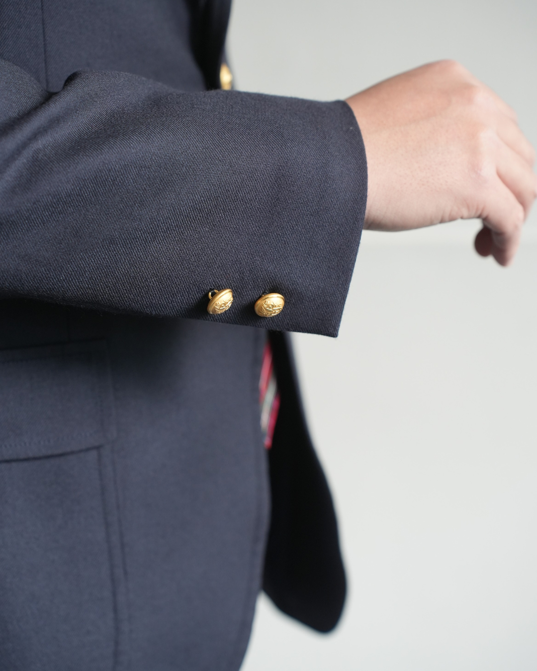 襟のロールが美しく立つのも6つボタンの利点です。