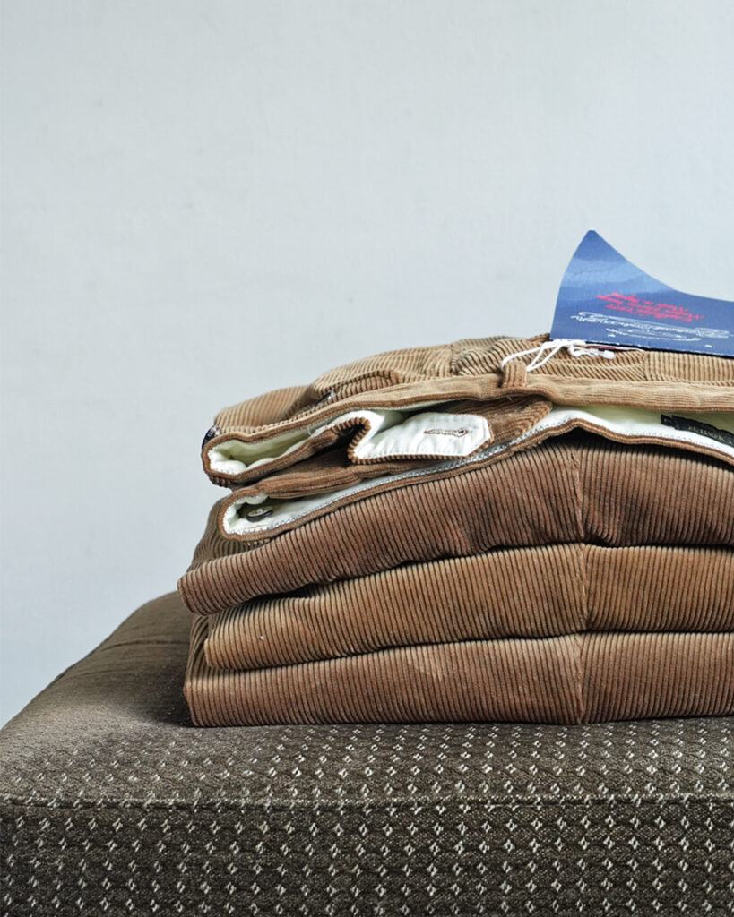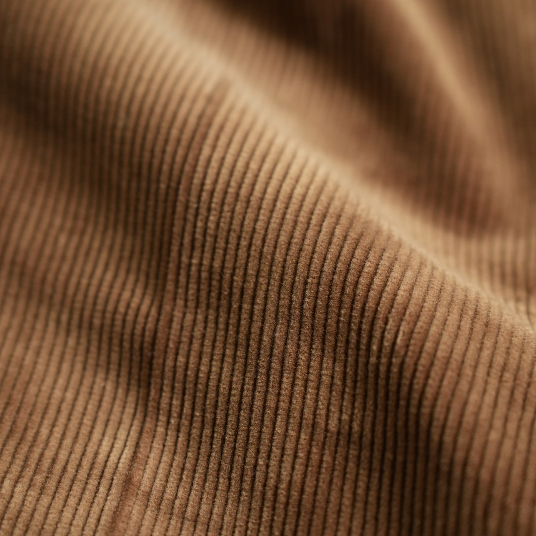 パイル立ちが良く、しなやかな風合いが魅力的なコーデュロイで一般的には太畝とされる9W(ウェル=畝の太さの単位)を採用。