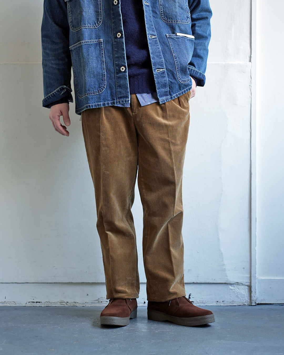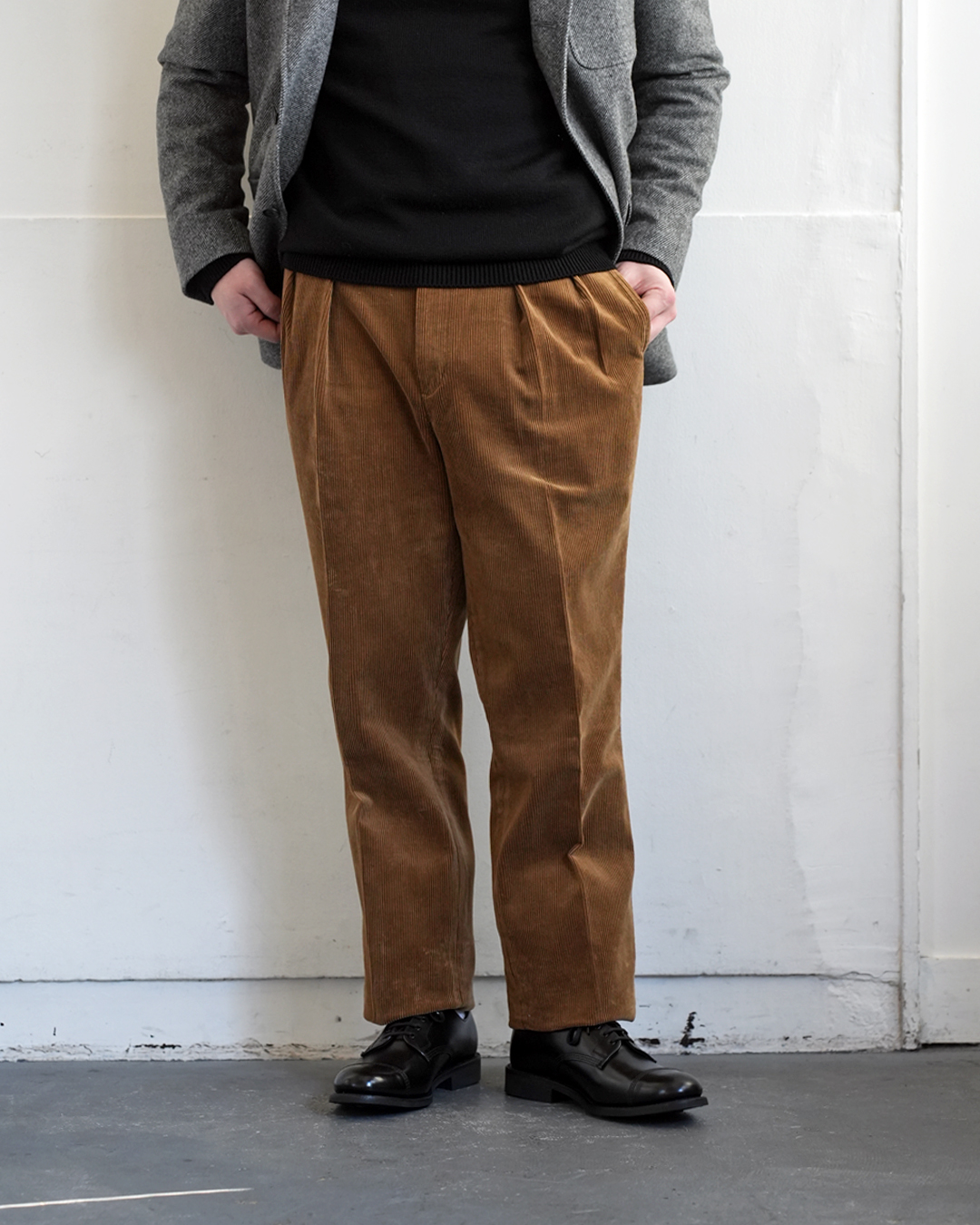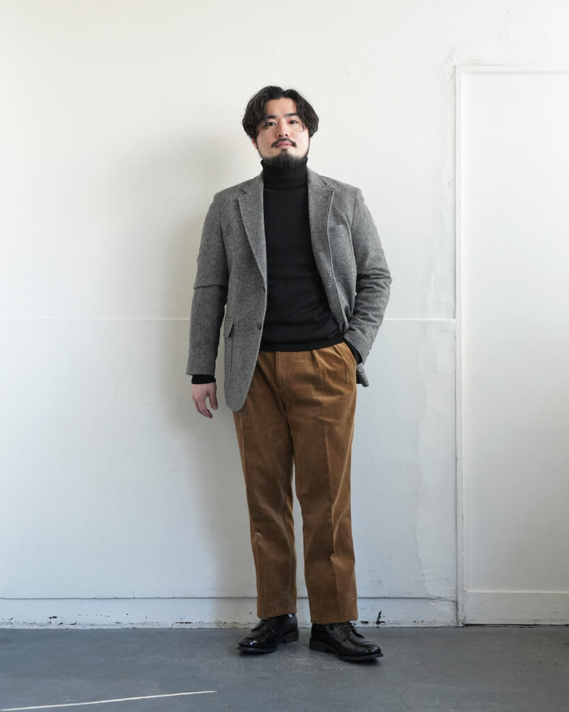 生地にボリューム感のあるパンツですので、ジャケットも同じく重量感のあるツイードとの組み合わせが◎