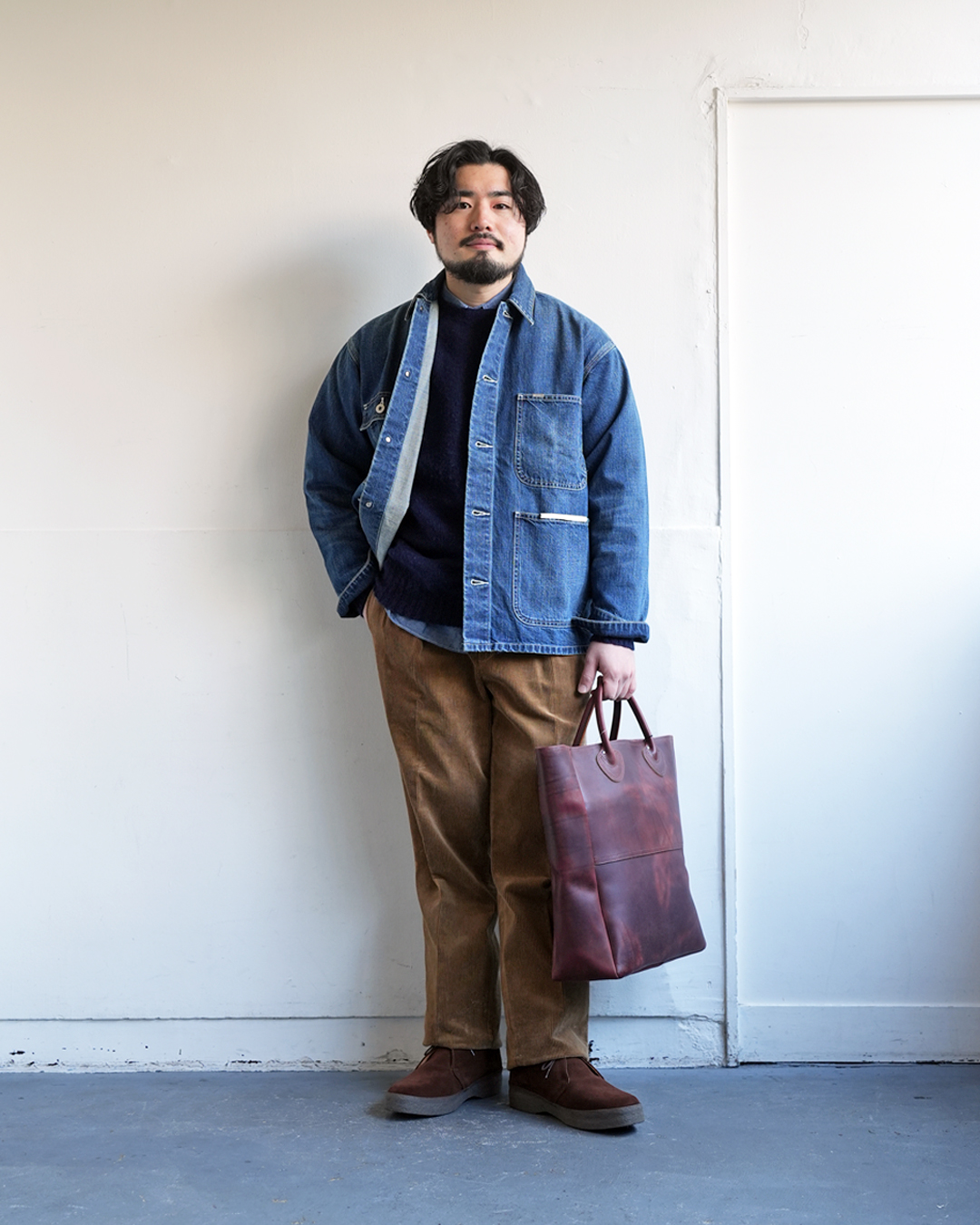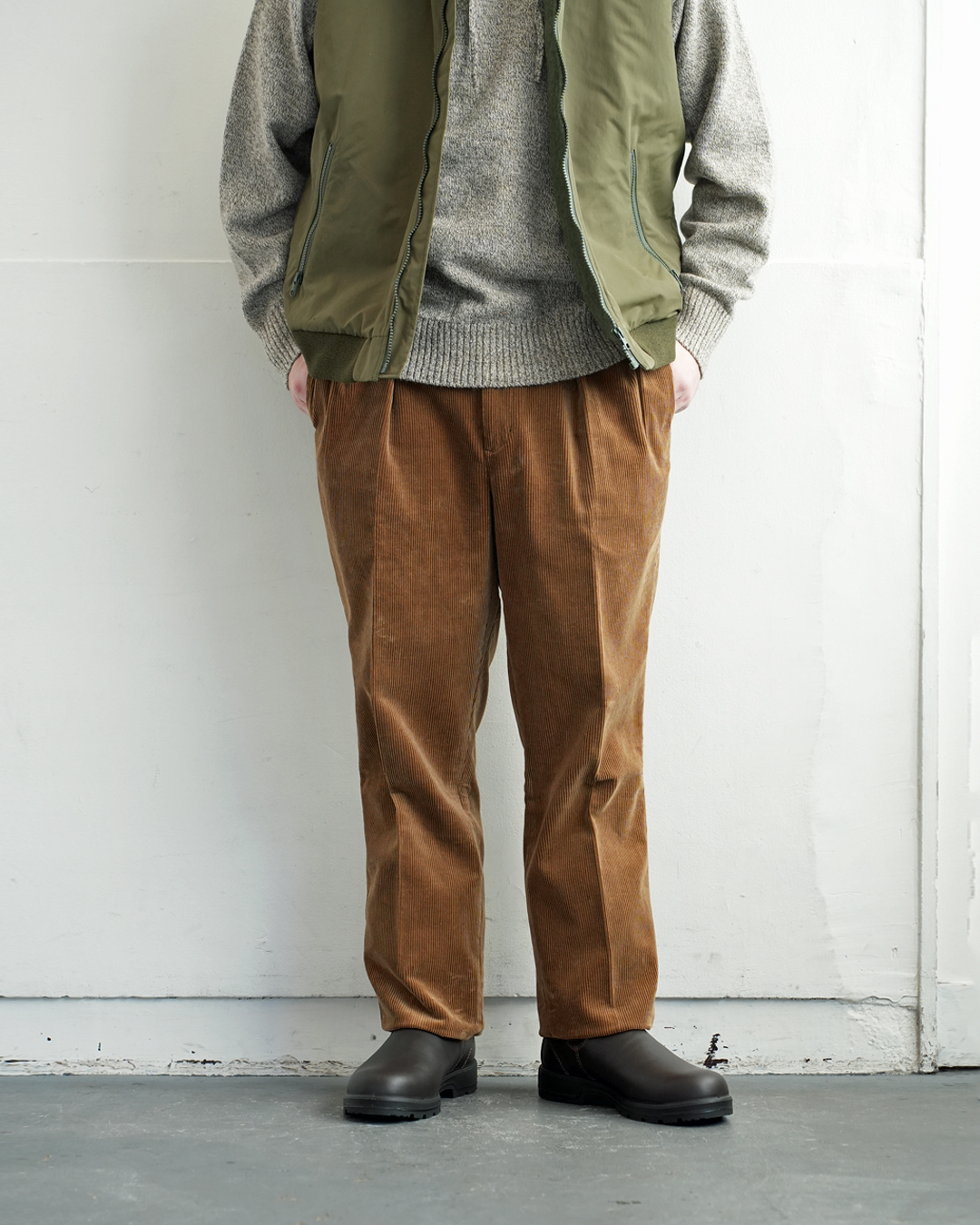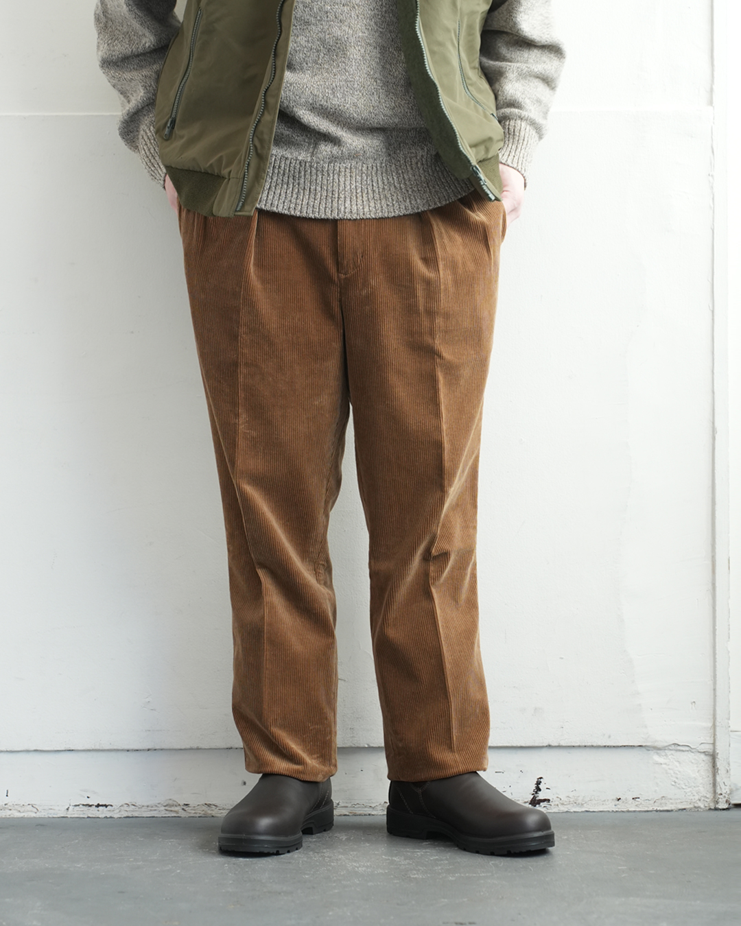 生地にボリューム感のあるパンツですので、ジャケットも同じく重量感のあるツイードとの組み合わせが◎