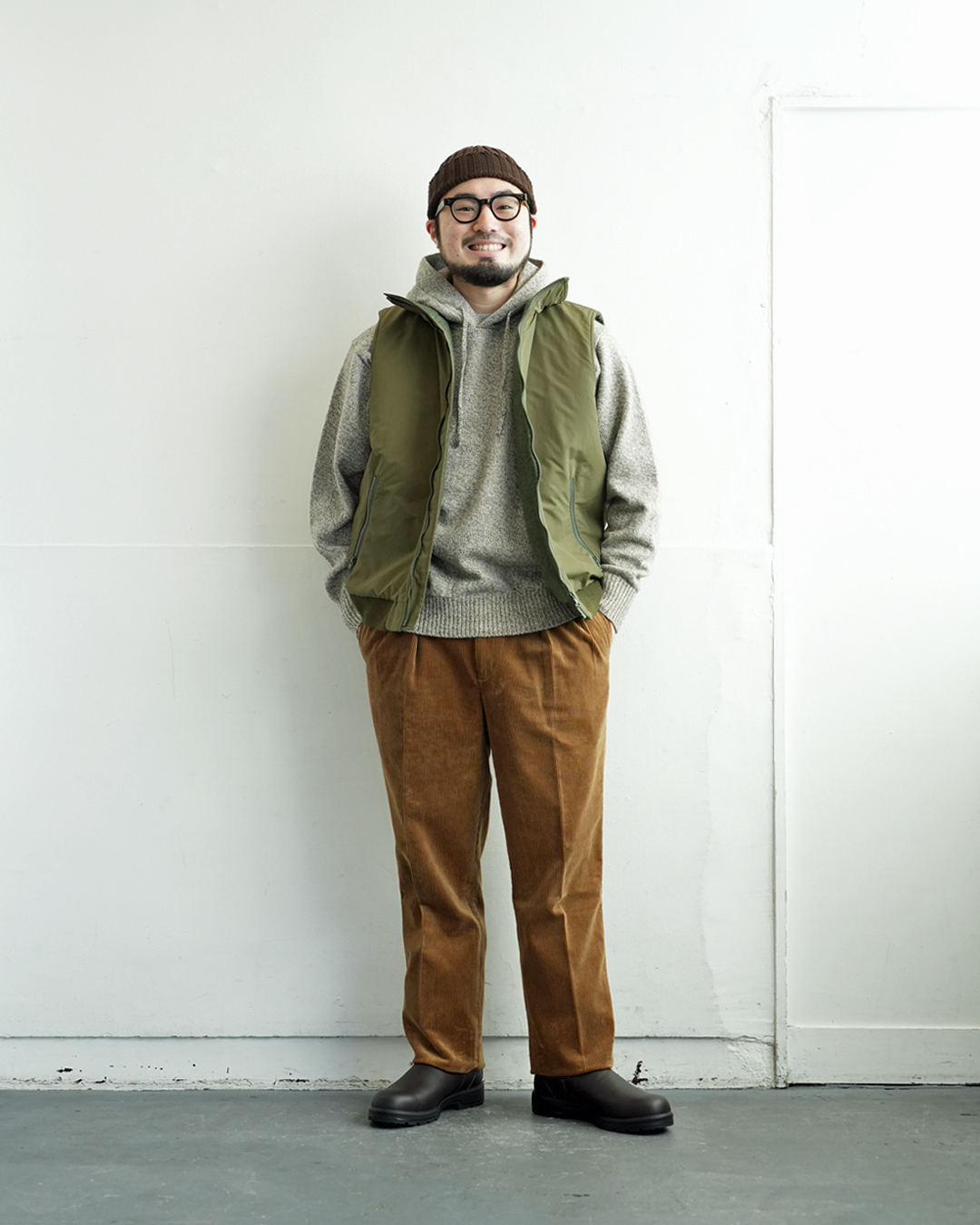 ブラウンの色味を活かす為にシューズやニットはブラックでシンプルに。