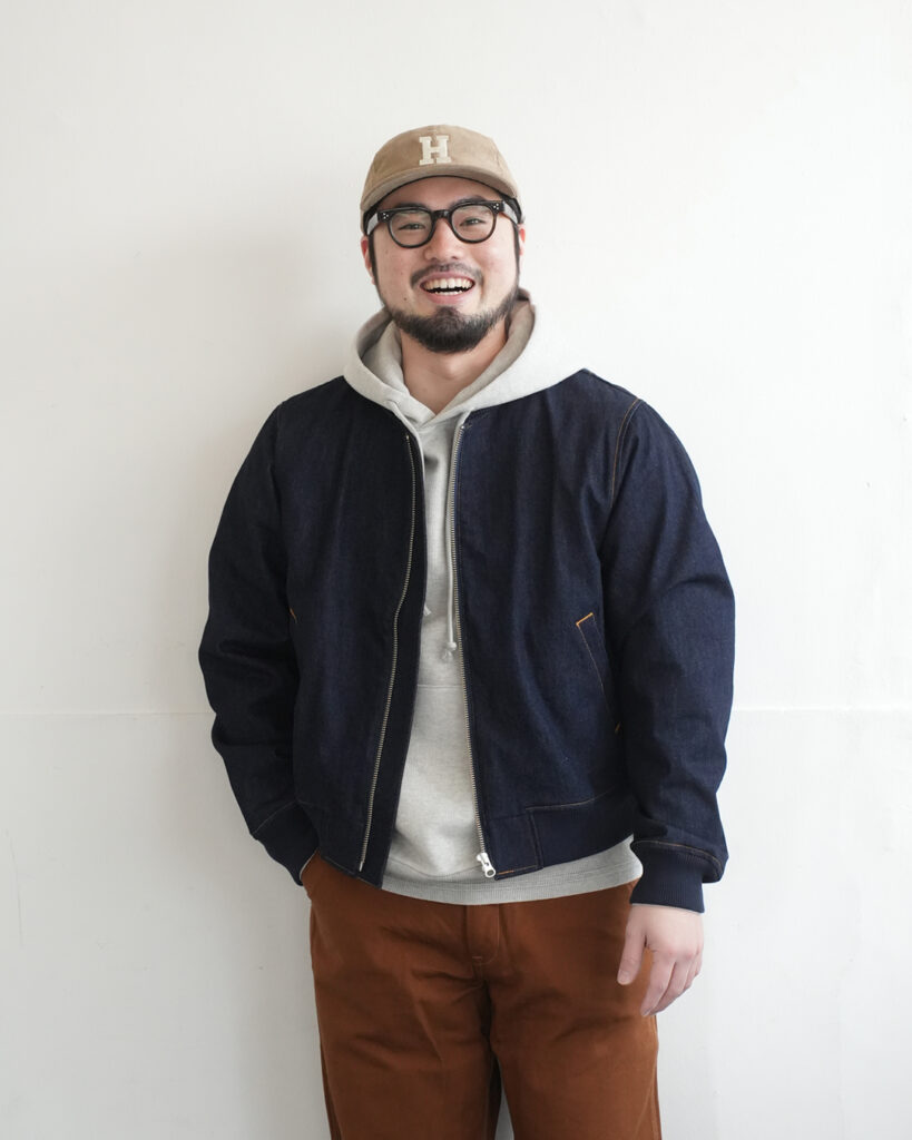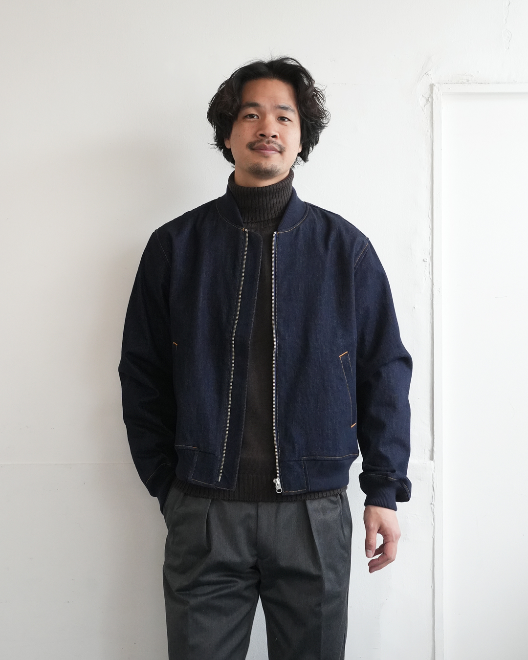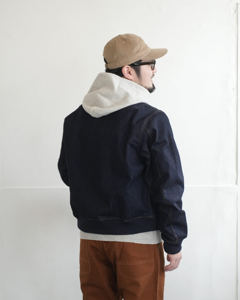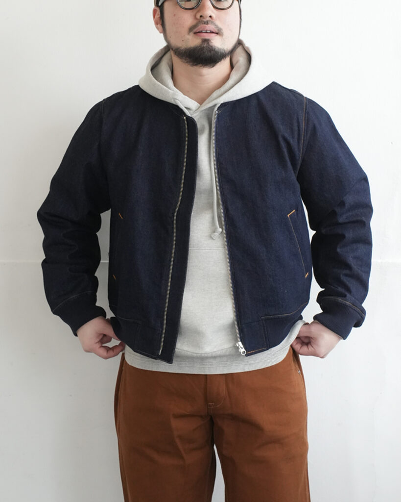 いわゆるデニムジャケットやカバーオールとは少し違い、ミリタリーのフライトジャケットをベースにブランドお得意のデニム生地で作られた1着です。