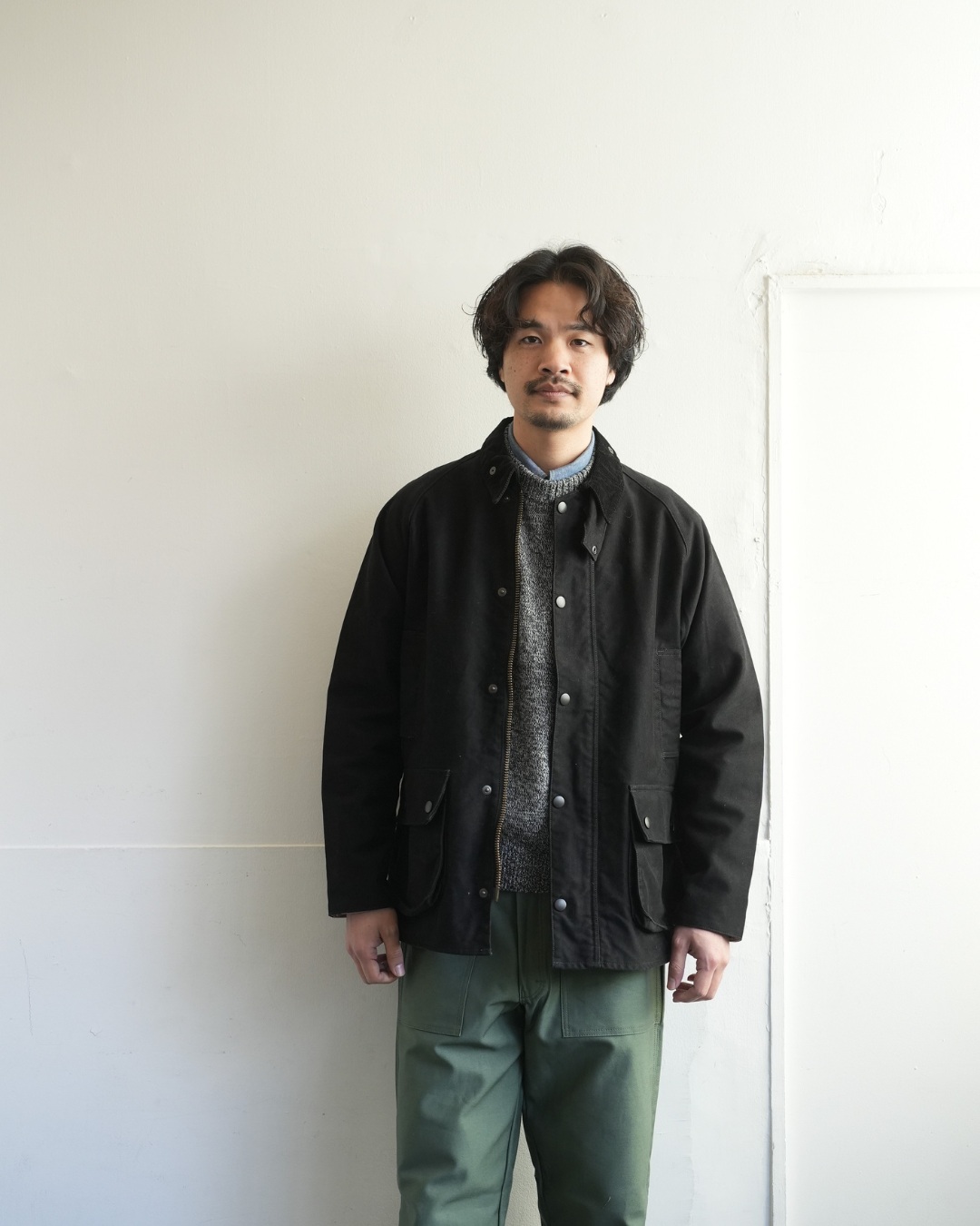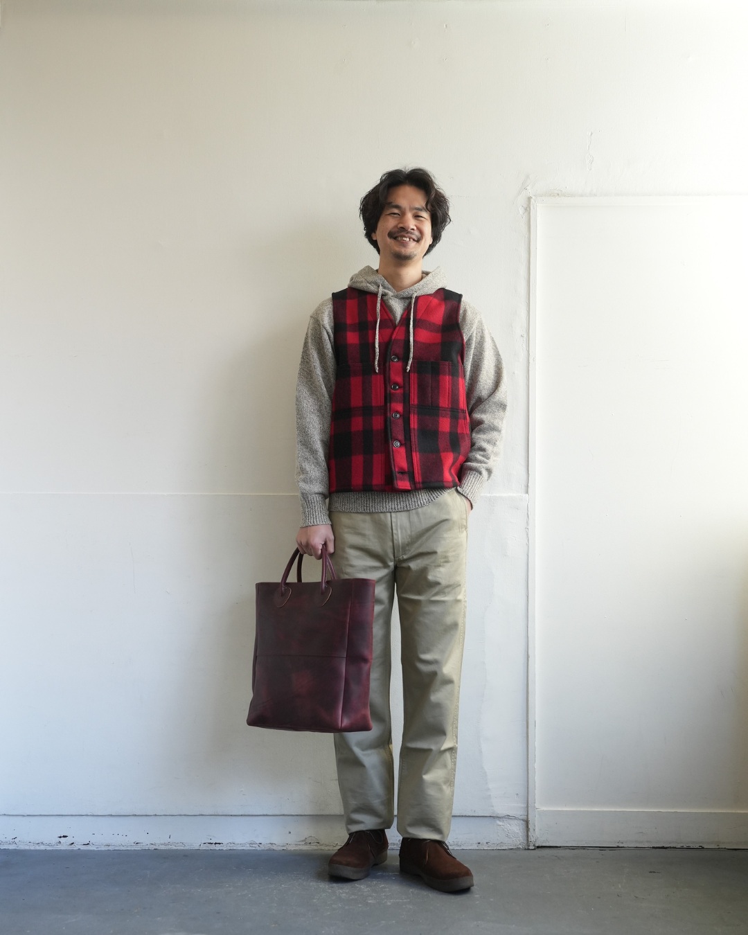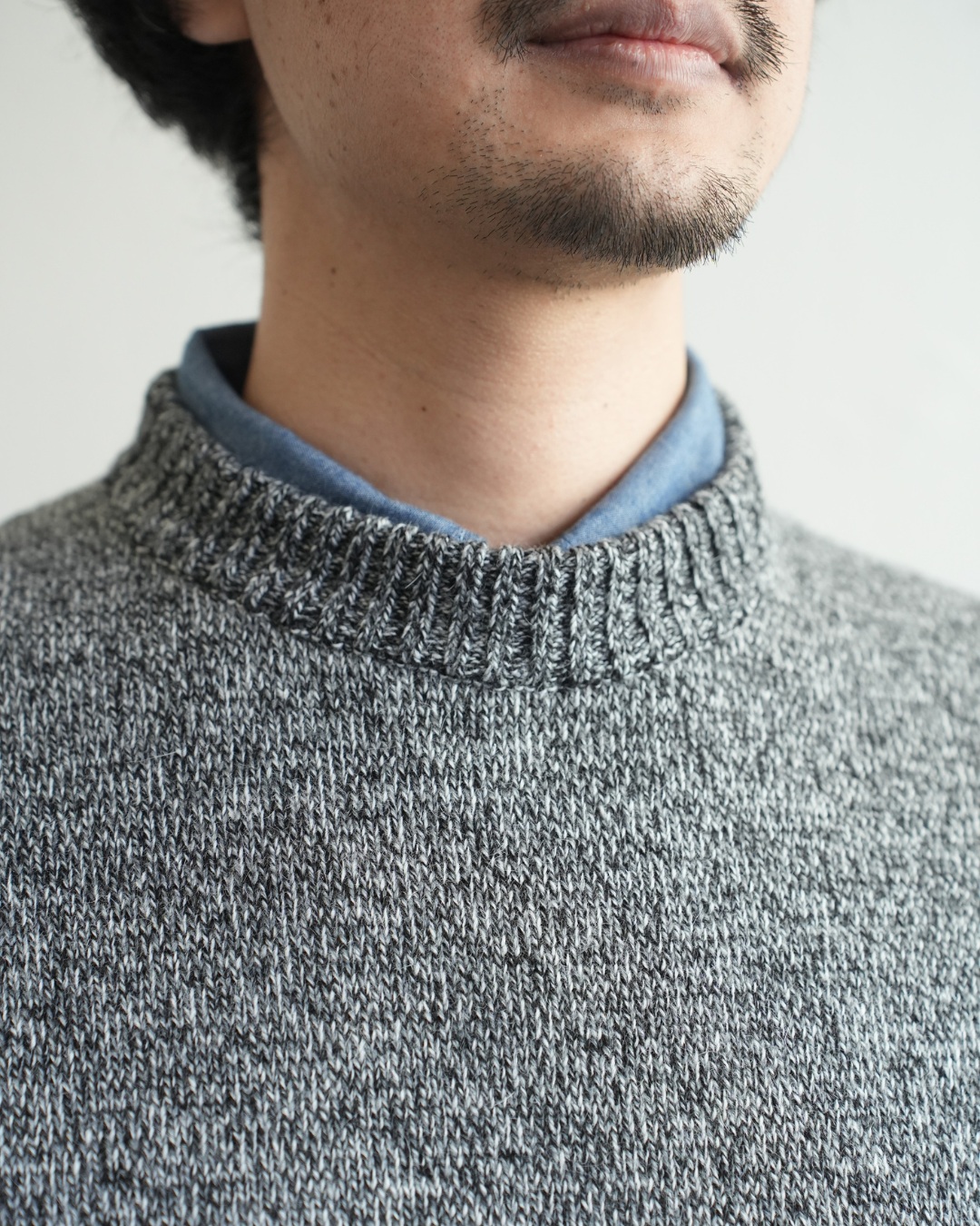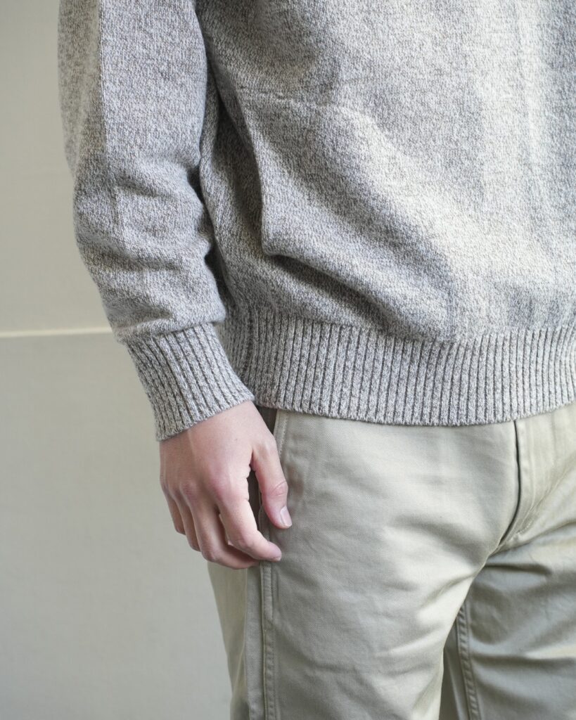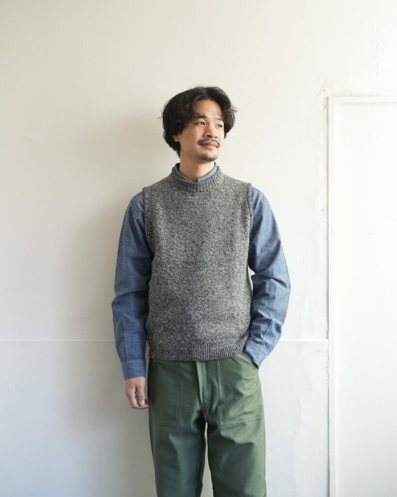 最後は、ベスト。優等生感が出てしまうアイテムですが、アンゴラ三つ杢にかかればカジュアル使いが容易に。