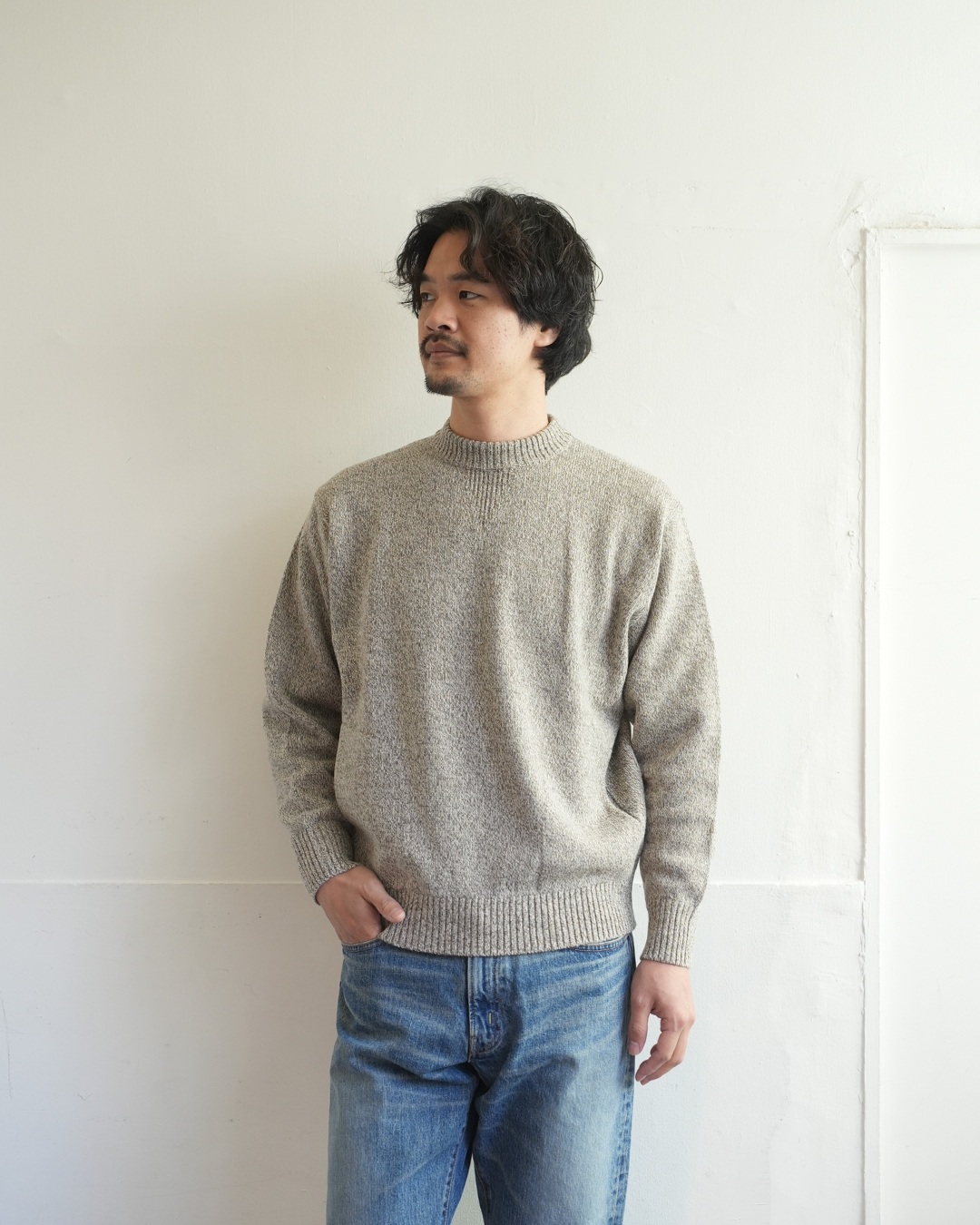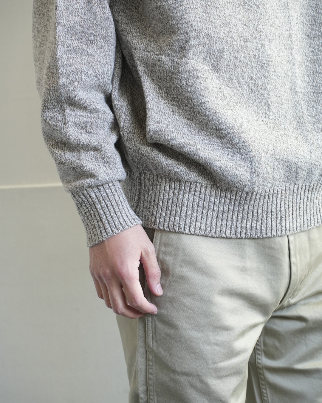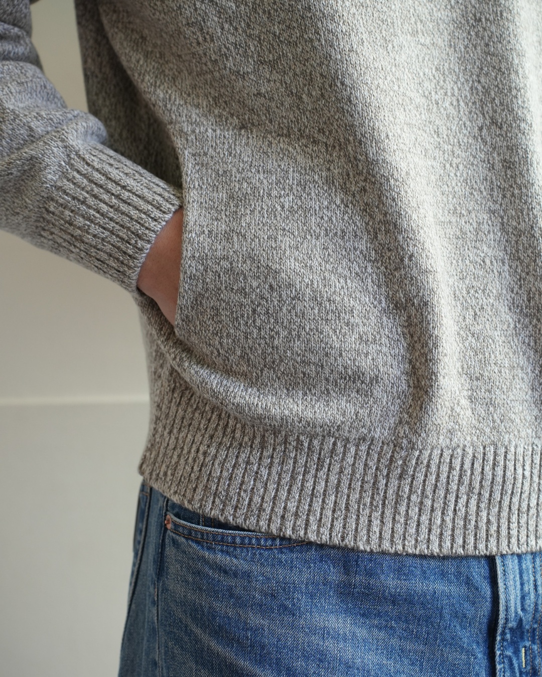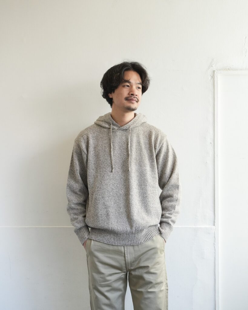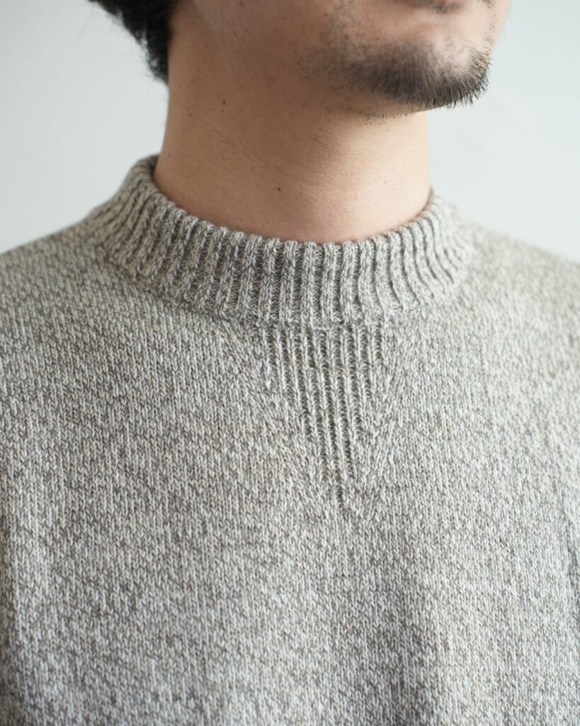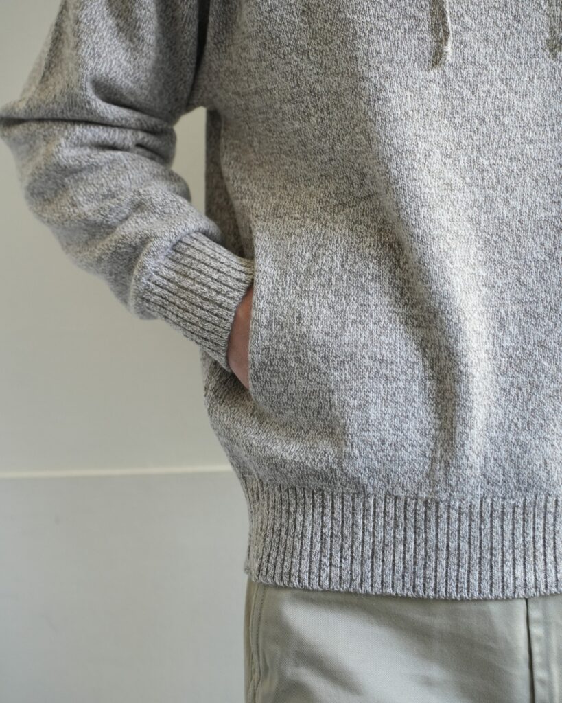 こちらのプルオーバーニットは、そんなアンゴラ三つ杢の素材感にピッタリ合ったヴィンテージスウェットライクな一着。編みで表現した首元のガゼット。長めで程よく効いている袖、裾リブ。極めつけはハンドウォーマーまで付いています。