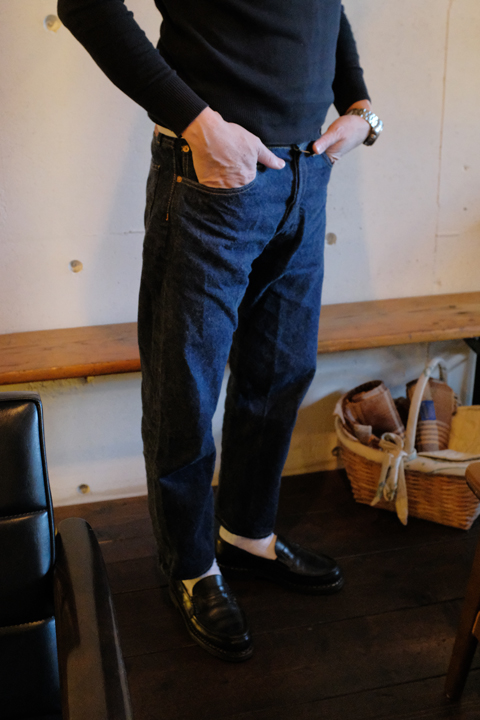この日はニットに合わせて、すっきりしたレングスの711に、PARABOOTのローファー。