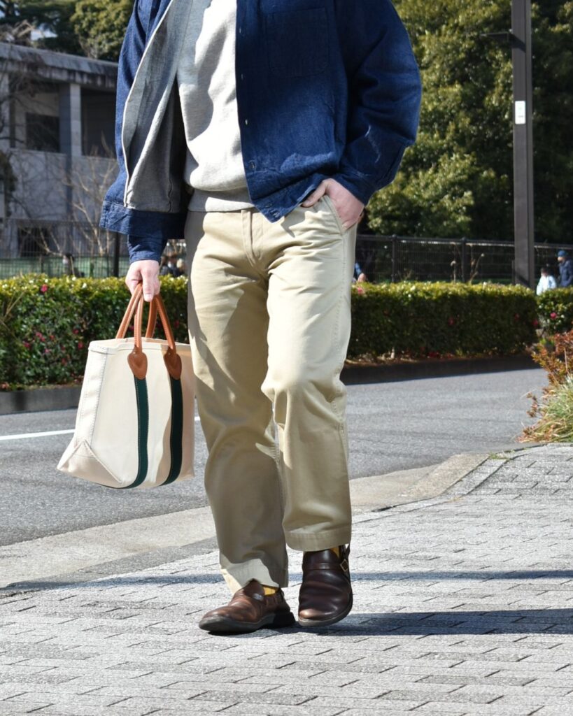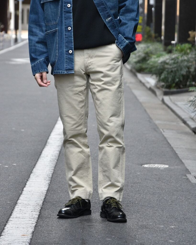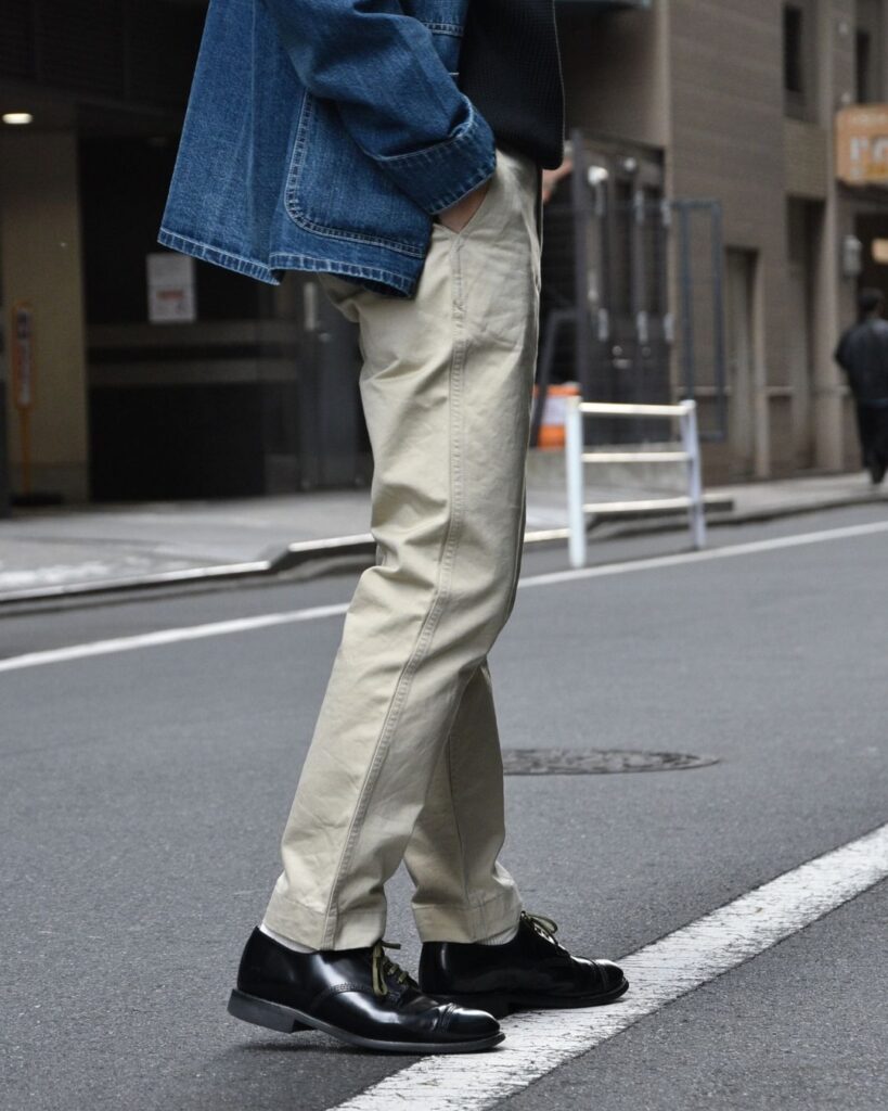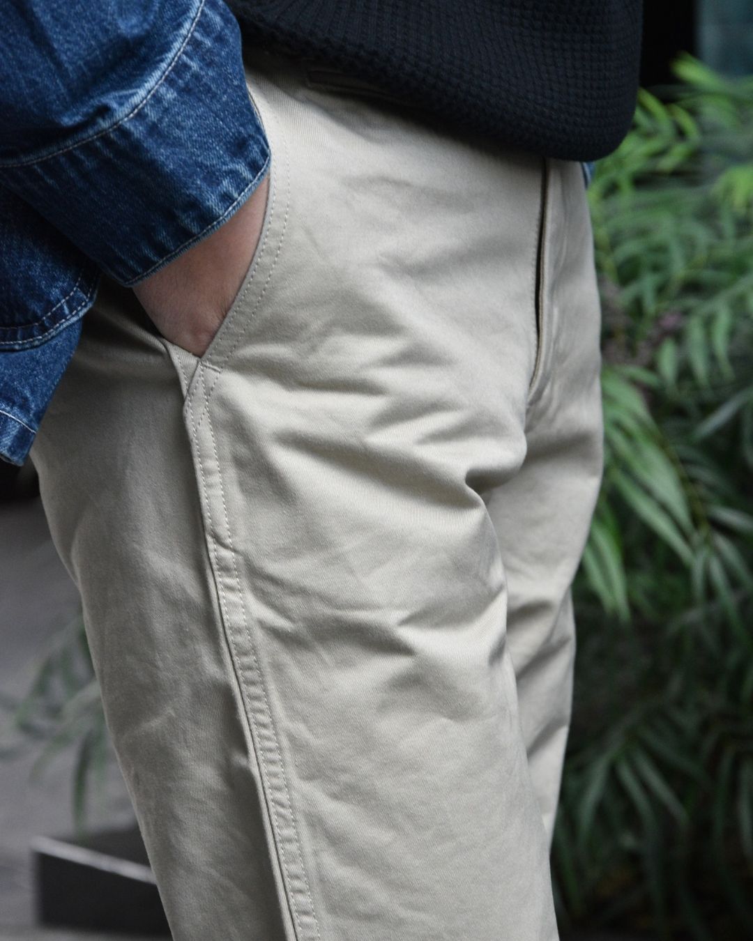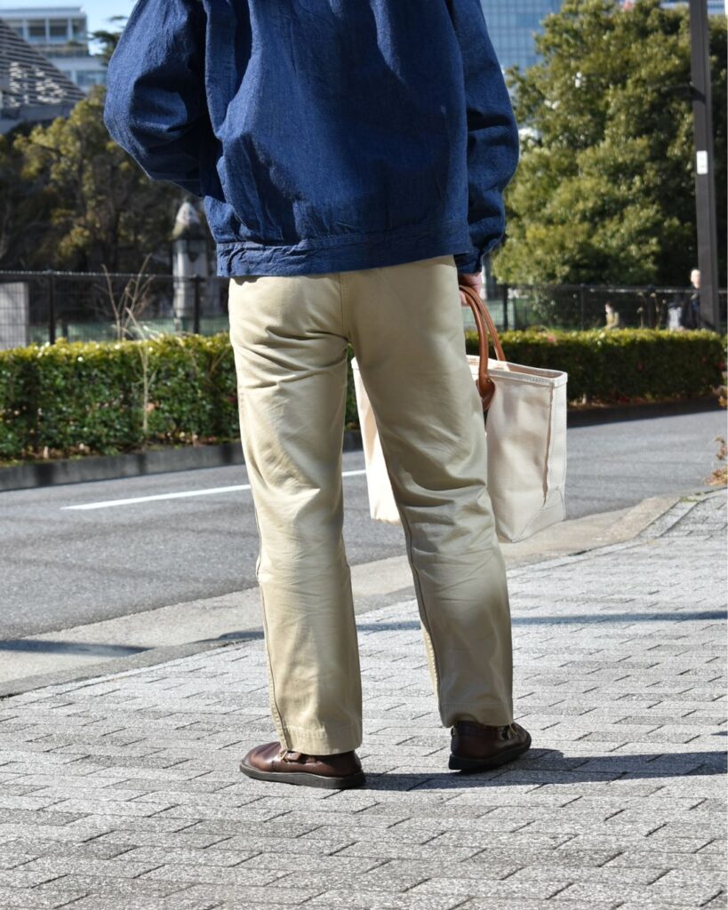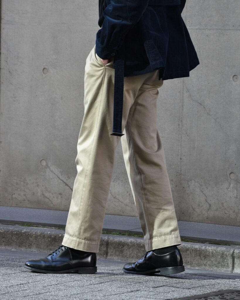 「一見すると武骨な印象ですが、ご覧の通りの綺麗なシルエット。アメリカンチノがベースでありながら、日本人が綺麗に穿くことのできるシルエットはカジュアルスタイルから、職場によってはお仕事にもお使いいただけるかと思います。」