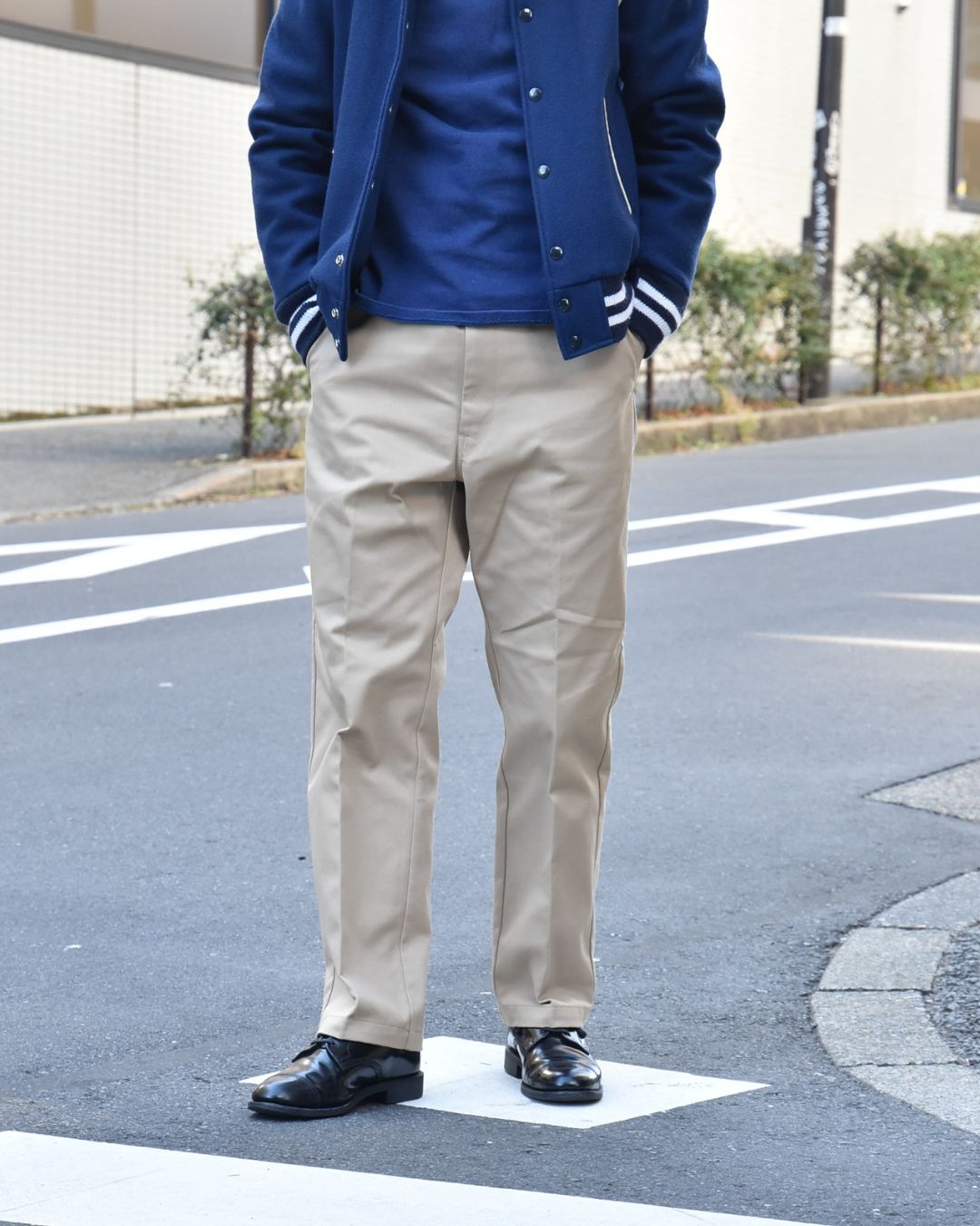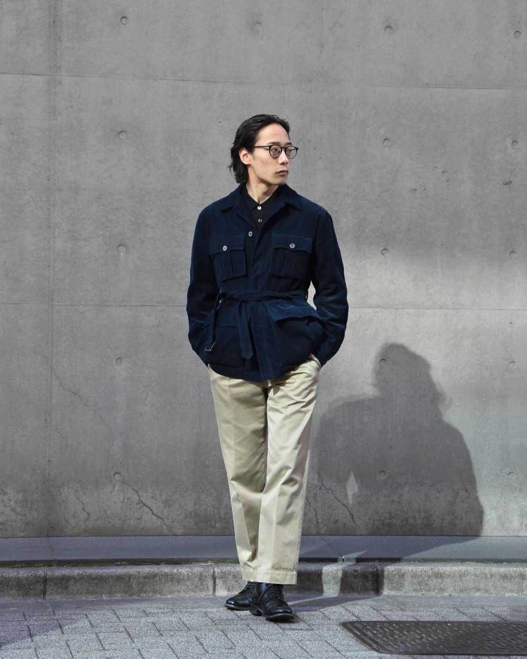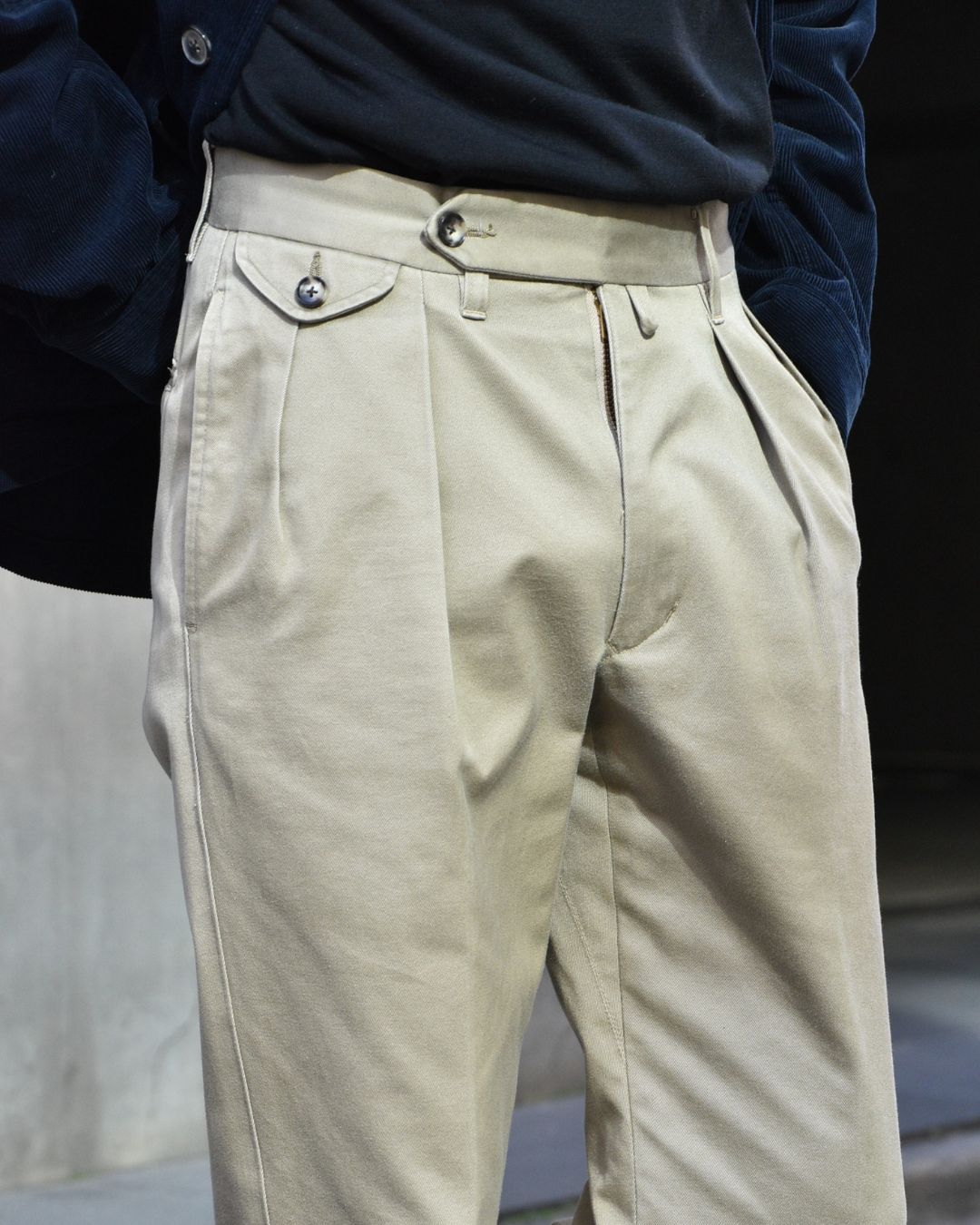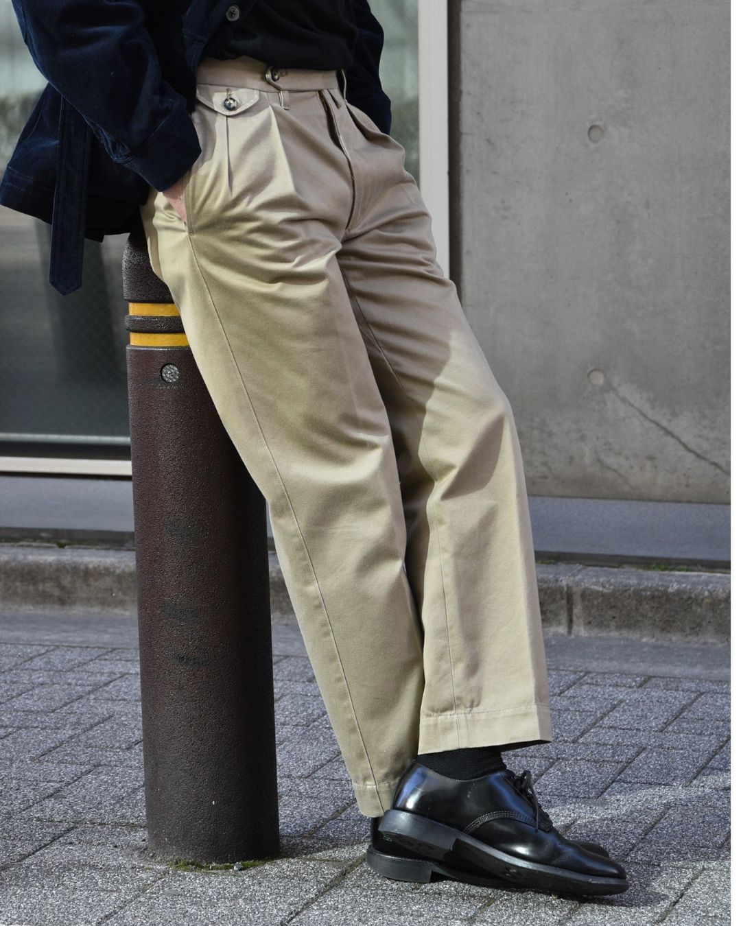 「一見すると武骨な印象ですが、ご覧の通りの綺麗なシルエット。アメリカンチノがベースでありながら、日本人が綺麗に穿くことのできるシルエットはカジュアルスタイルから、職場によってはお仕事にもお使いいただけるかと思います。」