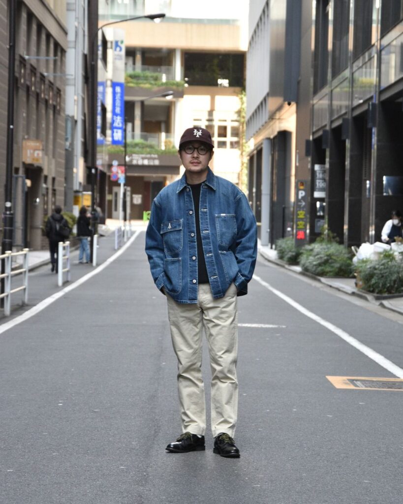 「いい意味で癖のないデザインですので、色落ち加工されたカバーオールに合わせてもくど過ぎず大人の方が楽しめるバランスにまとめてくれますよ。」