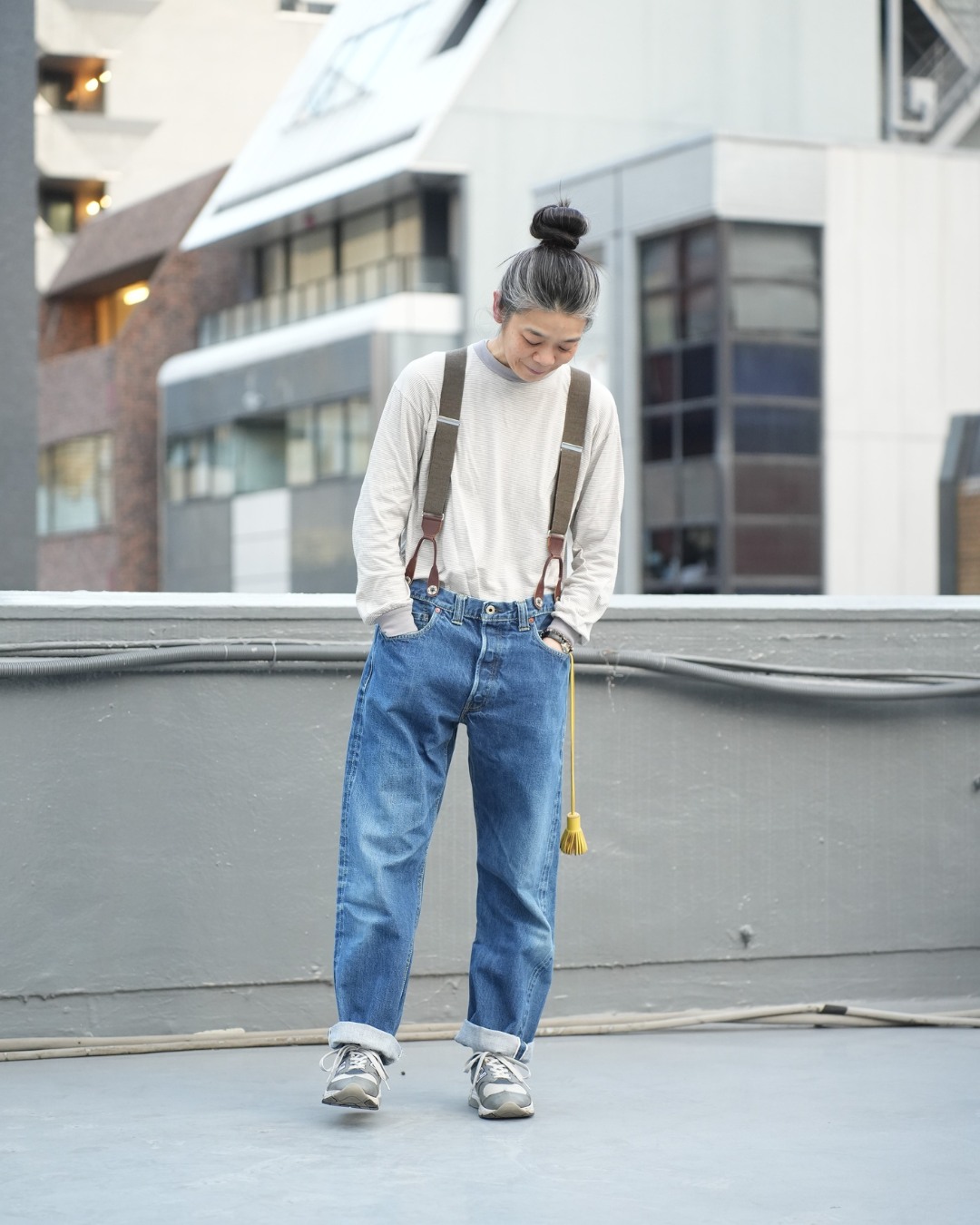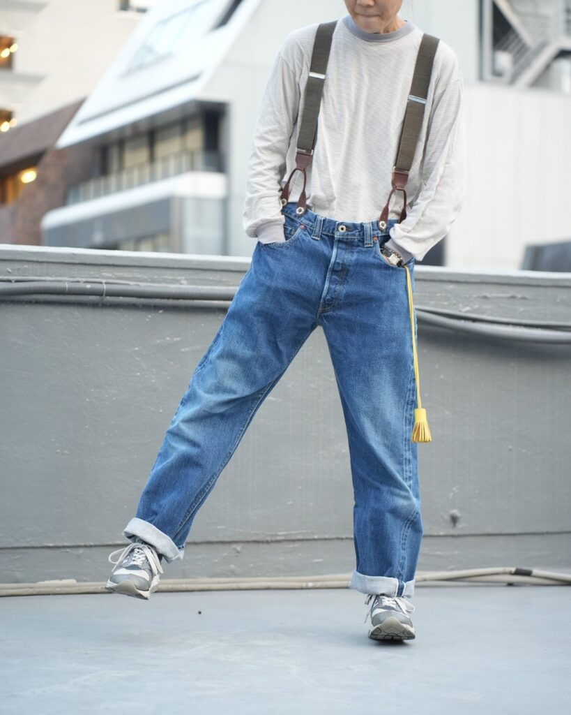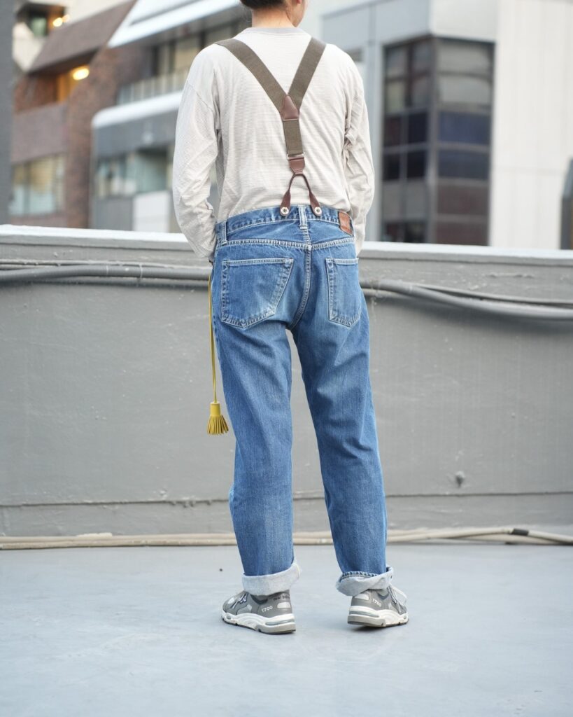 いつもはナウンのベルトナイロンでウエストをギューっと締めて、腰元からタラリーンと垂らせば出来上がりのスタイル。色んな色のベルトナイロンを日替わりでつけてごきげんで過ごしてはいたものの、ずっと試したかったのが前著のサスペンダー。