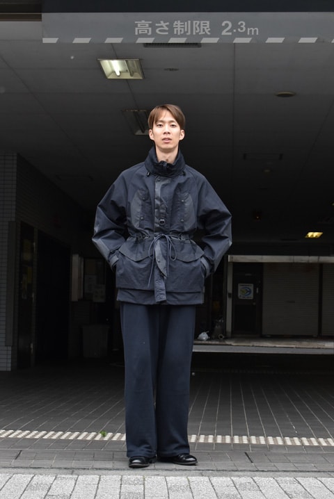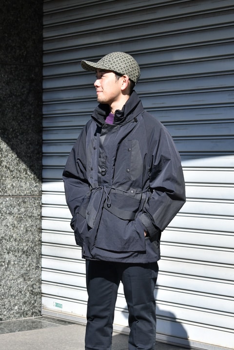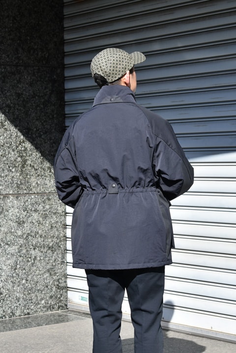 素材にはハードタッチの撥水塩縮ナイロンを使用しており、シボ感のあるドライなタッチと強いハリ感が特徴です。