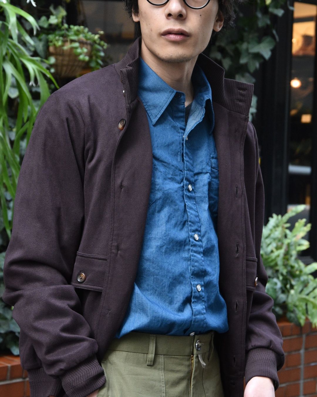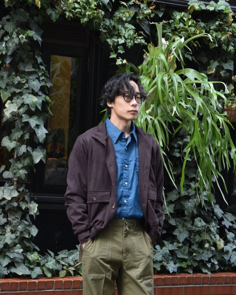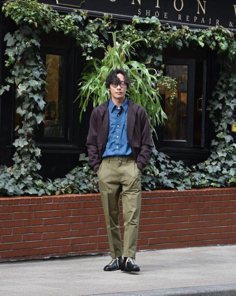 隊長はブラウンを使ってもらいました。ブルーのシャツをインナーにして襟を倒すのがスタイルとのこと。オリーブのパンツもブラント相性抜群ですね。