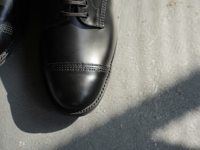 製法はグッドイヤーウェルト。使用している革はポリッシュドレザーと呼ばれる、カーフをガラス加工したものです。元のカーフも上質なものを丁寧に加工するので、ひび割れ知らず。