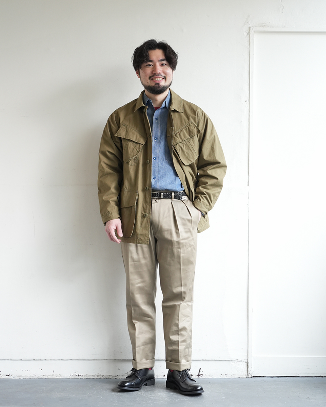 コットン地のミリタリー由来のジャケットですが、F.O.B FACTORY(エフオービーファクトリー)とJAPAN BLUE JEANS(ジャパンブルージーンズ)のそれらはどちらも軍ものらしい武骨さはありながらも現代的なサイジングにて仕立てているので、土臭さは程々で品よく着こなせるのが特徴です。
