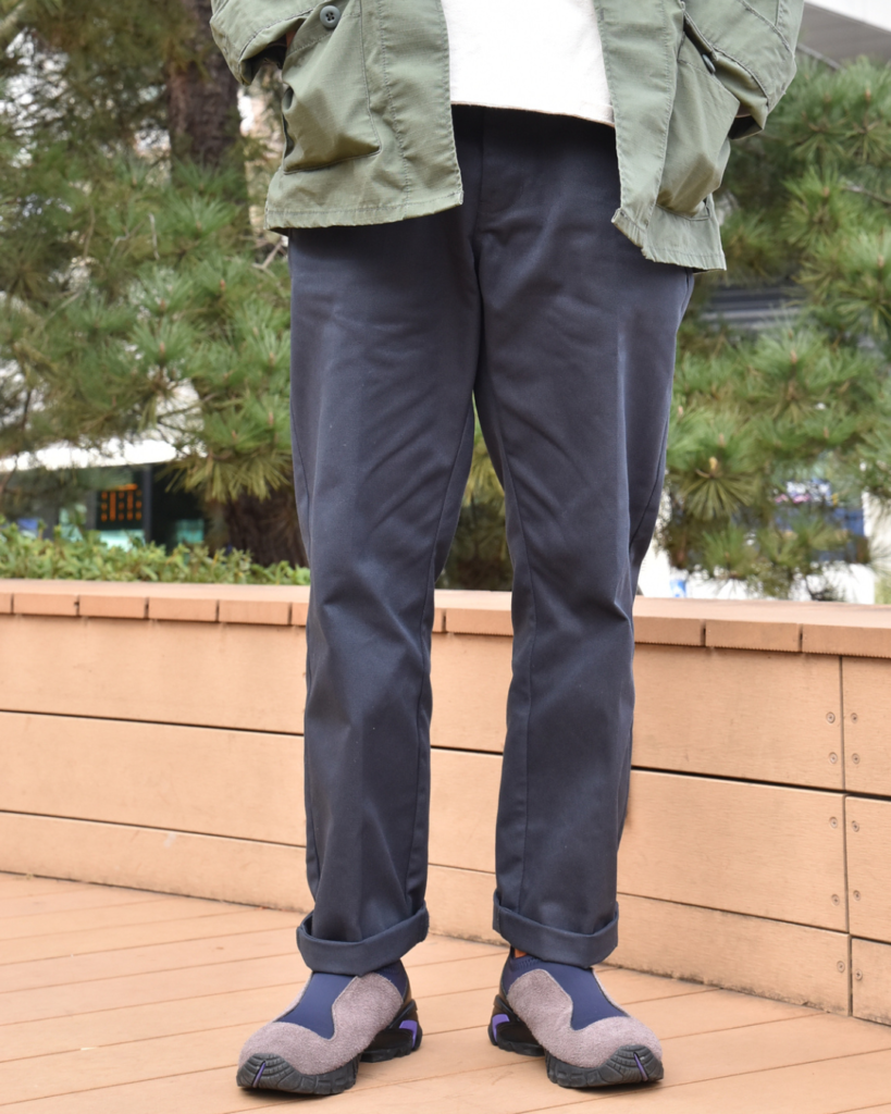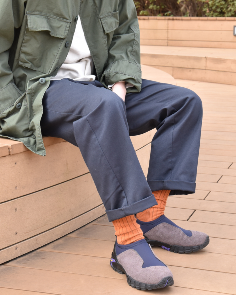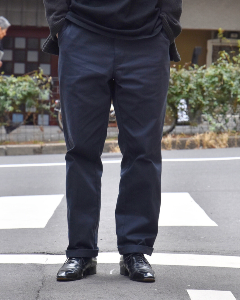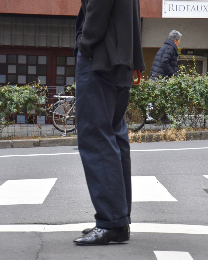 緩めのストレートながらも裾にかけて若干テーパードがかかっておりますので、野暮ったくなりません。加えてセンタークリースが最初から入っているのもポイント◎