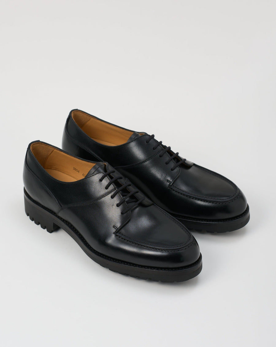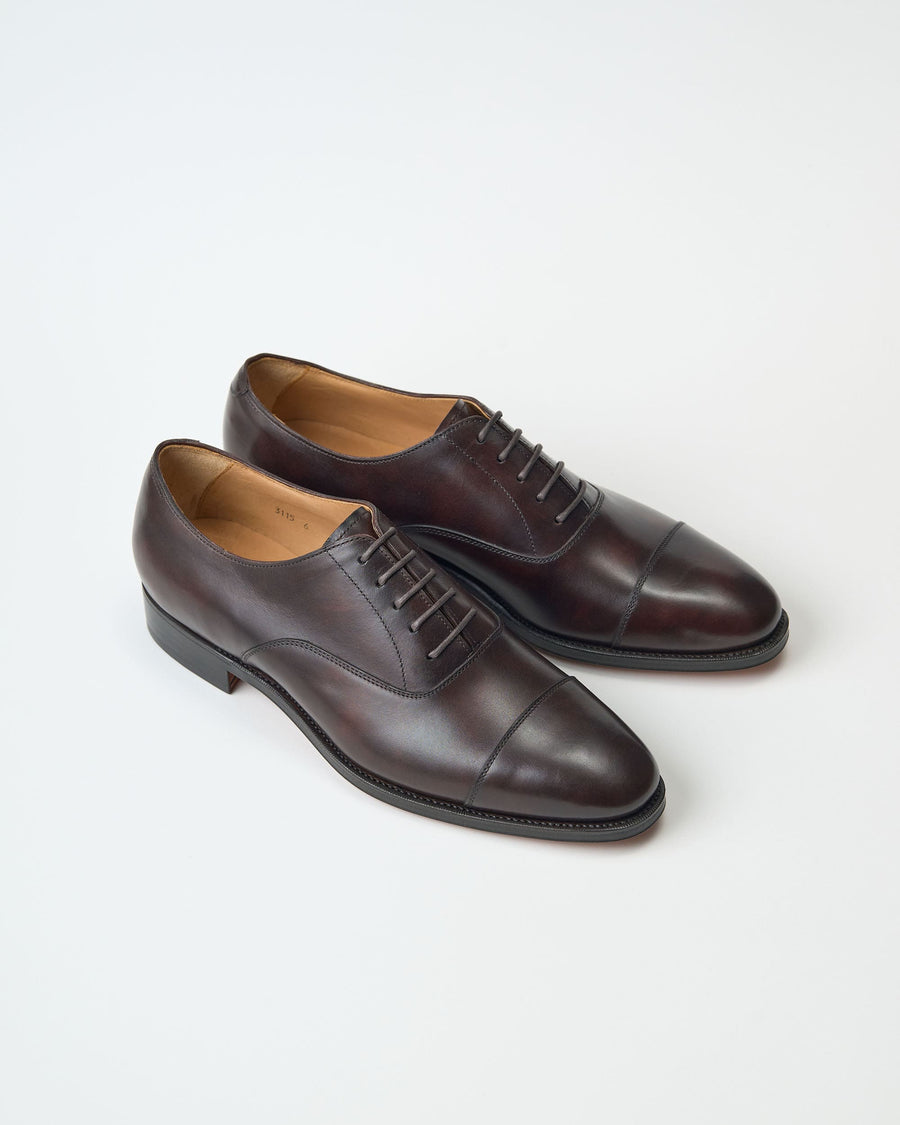 カジュアルに履ける黒靴をコンセプトに、柔らかくてほんの少し艶を抑えたボックスカーフを選びました。肌目が細かいカーフなので、抑えめな光沢感の中にも質感の高さがあります。ソールのコバをブラウンに染めているので、ストイックになりすぎずカジュアルなスタイリングとの親和性が高いです。