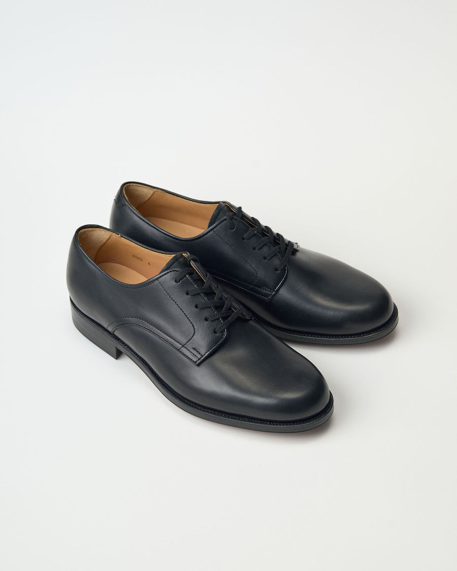 黒のボックスカーフはコシが強く硬めのものが多い中で、このモデルには柔らかくしっとりとした質感のものを選びました。無骨な雰囲気に合う控えめな光沢と決して粗野になりすぎないきめの細かさが特徴。つま先のライニングには、ORIENTALオリジナルレザーを使用。柔らかく仕上げたこのレザーは足当たりと馴染みの良さに寄与しています。ソールは耐久性の高さと重厚感のあるコマンドソールを使用。