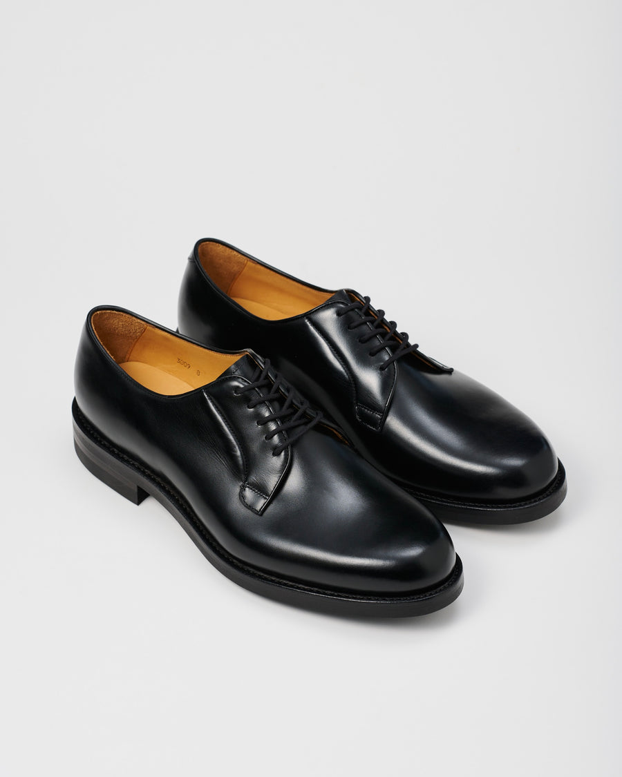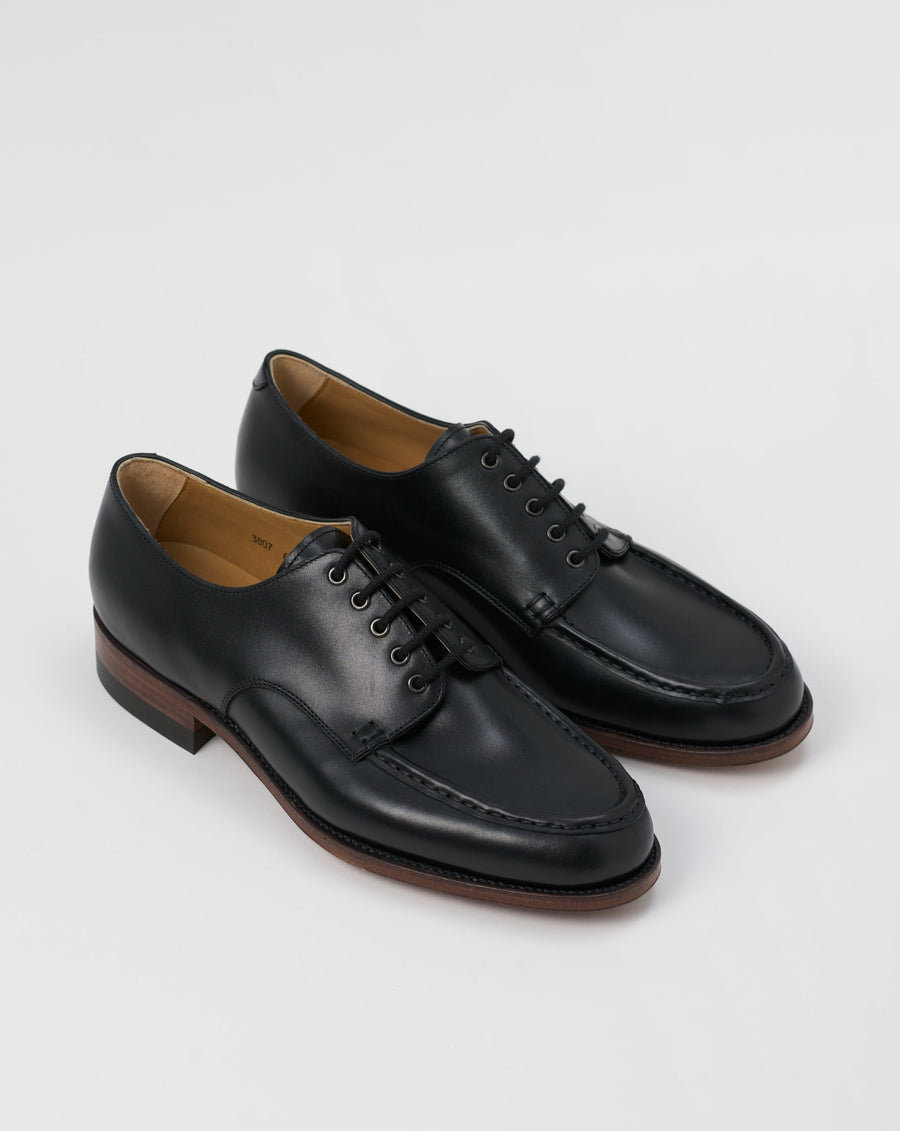 カジュアルに履ける黒靴をコンセプトに、柔らかくてほんの少し艶を抑えたボックスカーフを選びました。肌目が細かいカーフなので、抑えめな光沢感の中にも質感の高さがあります。ソールのコバをブラウンに染めているので、ストイックになりすぎずカジュアルなスタイリングとの親和性が高いです。