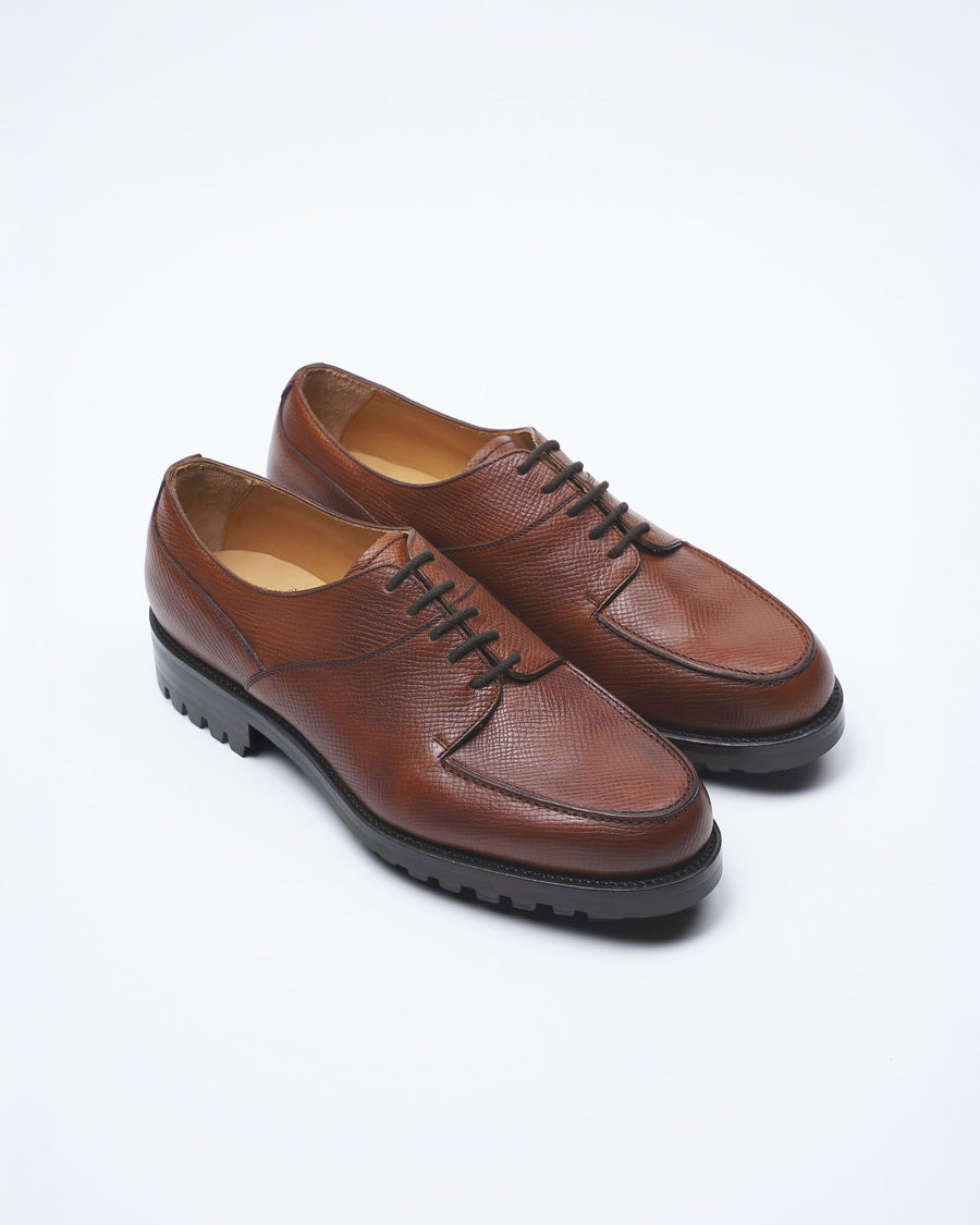 フランス・HAAS(アース)社のUtah calf(ユタカーフ)という型押しカーフを使用しています。オイルの配合にこだわったこの革はとても馴染みがよく、柔らかいのが特徴。クリームの吸い込みが良いので、お手入れの際に色に深みを加えていくことができます。型押しのカジュアルな表情と、柔らかい足あたり、エイジング、3つの要素を兼ね備えたレザーです。つま先のライニングには、ORIENTALオリジナルレザーを使用。柔らかく仕上げたこのレザーは足当たりと馴染みの良さに寄与しています。ソールは耐久性の高さと重厚感のあるコマンドソールを使用。