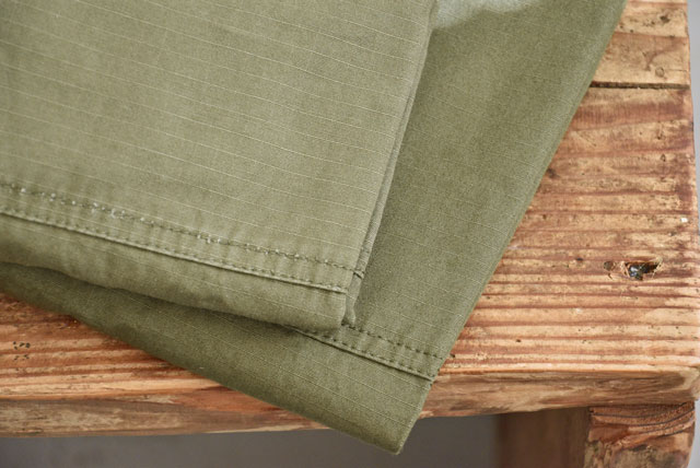 この生地は洗濯を繰り返すたびに自然な色落ちやアタリが楽しめますので、ラフに楽しみたい方はガシガシ着て洗ってを繰り返していただきたい。