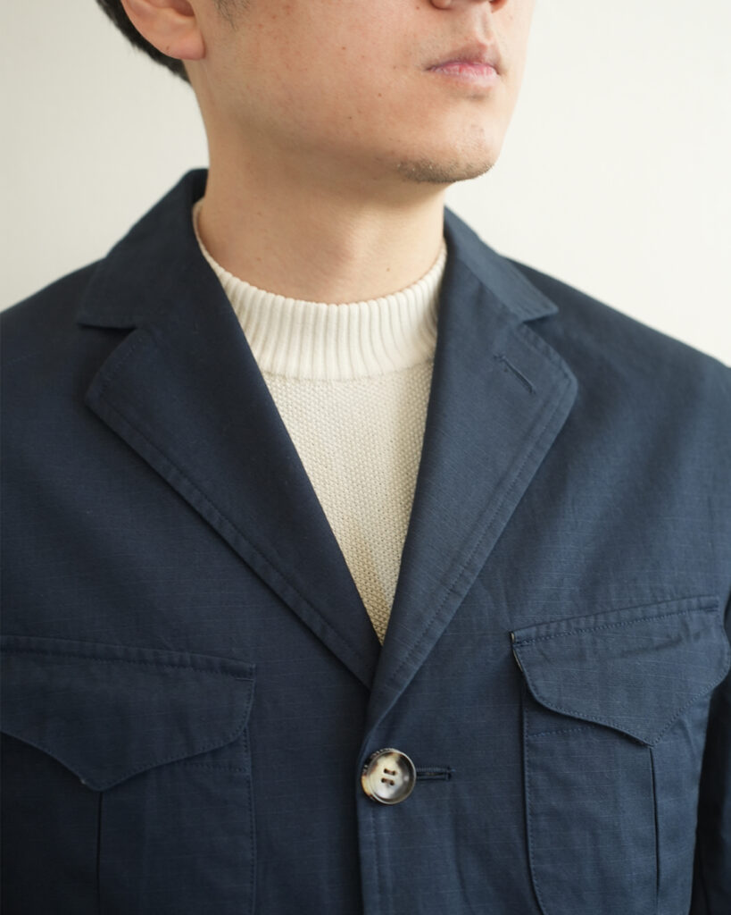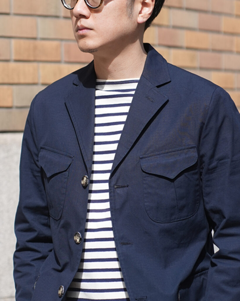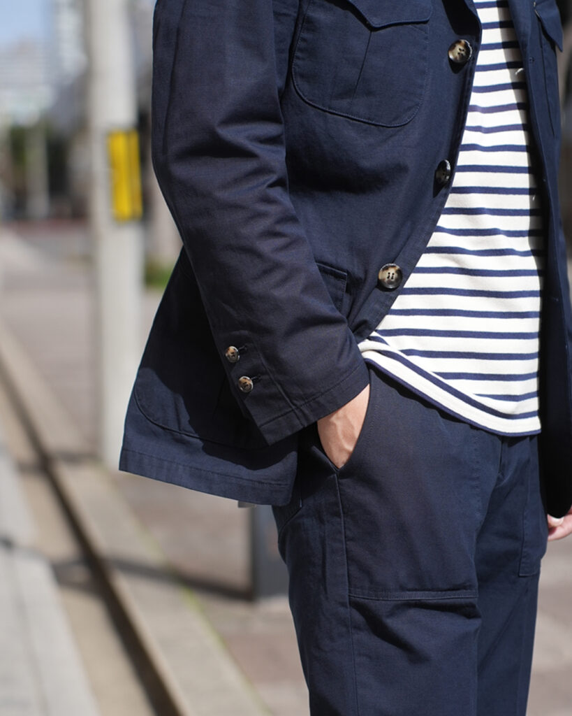 ネイビーながらもリップストップの軽さや各所のディティールも相まってインナーはシャツからセントジェームスのようなカットソーまで対応可能。