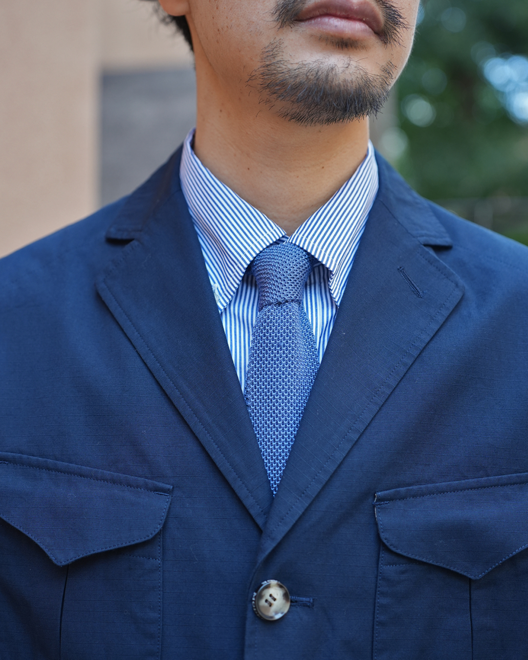 ネイビーながらもリップストップの軽さや各所のディティールも相まってインナーはシャツからセントジェームスのようなカットソーまで対応可能。
