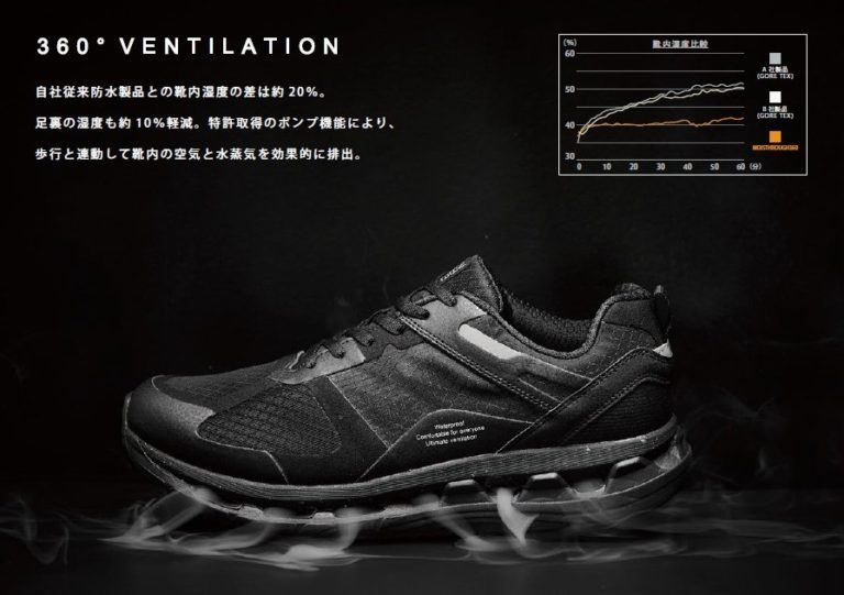 従来の「透湿防水」は靴内の湿気を排出しやすい機構であって、必ずしも靴内の換気を担うものではありません。