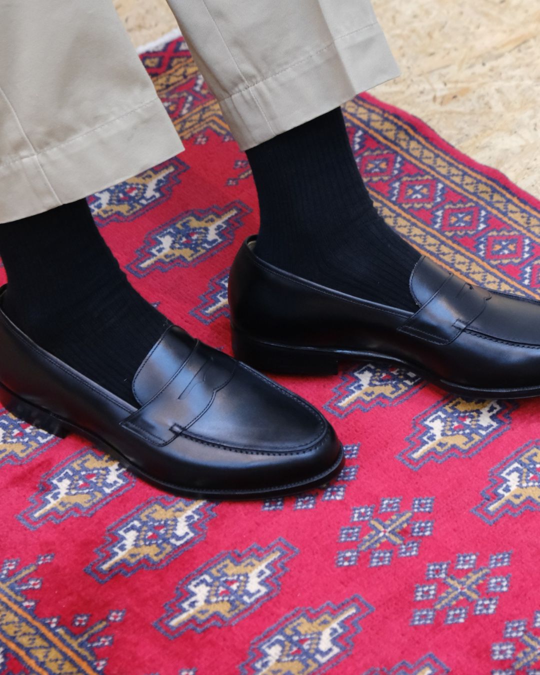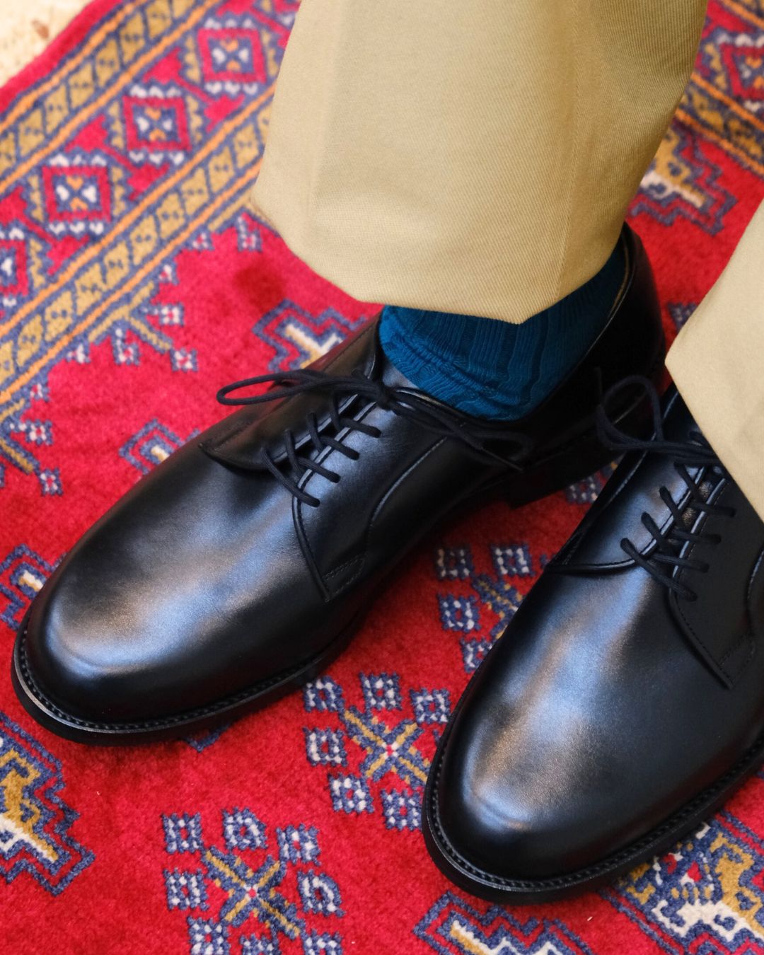 アッパーにはヨーロッパ産のボックスカーフを使用しています。黒みはしっかりと担保しながら、やや控えめな艶感が、程よい品の良さを醸し出しています。